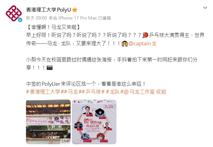 今日(20日)上午,馬龍身穿一身藍色運動裝,現身理大校園,瞬間引發校園師生圍觀。在活動環節,馬龍與霍啟剛、郭晶晶「夢幻聯動」,同台對打乒乓球,貢獻罕見表演賽,現場吶喊歡呼聲此起彼伏。網民紛紛表示激動,稱「這大場面也是被我見上了」。