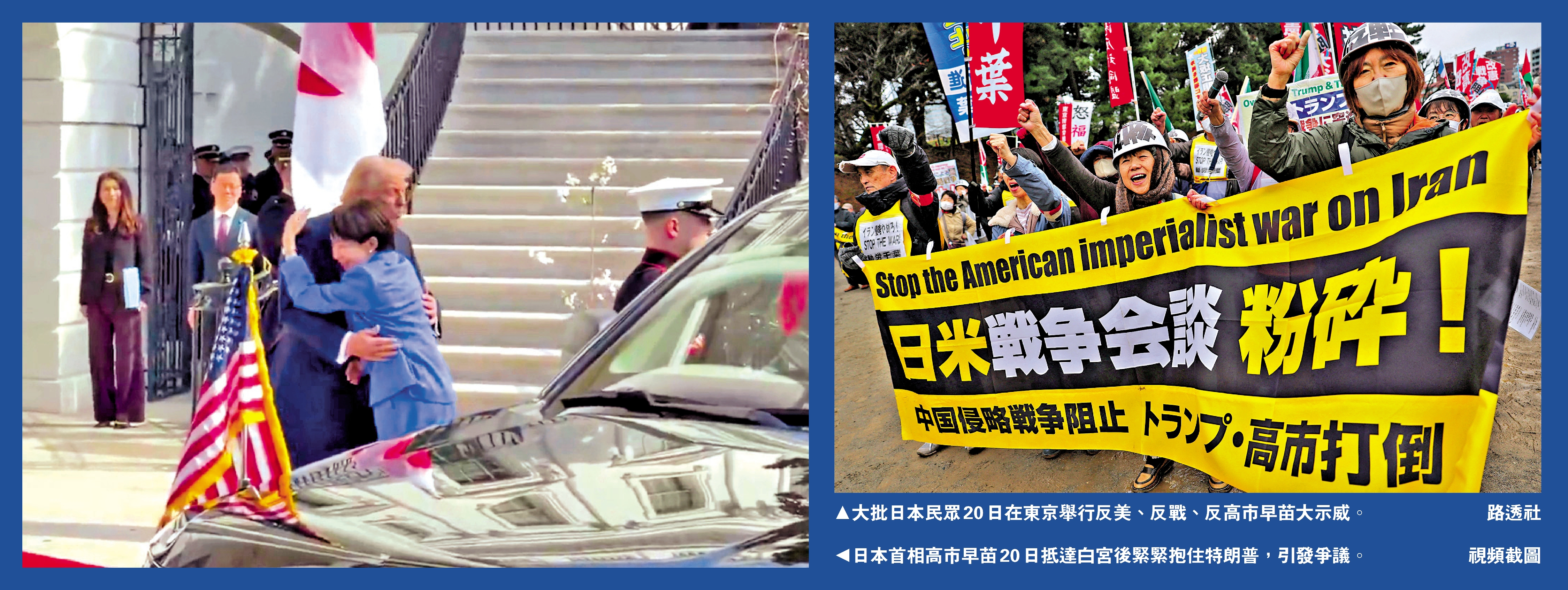 大公報綜合報道,當地時間19日,美國總統特朗普在白宮與日本首相高市早苗舉行會晤。兩人一見面,高市就上前緊緊抱住特朗普,引發爭議。有網友稱,這樣的畫面,「充分展示了高市對特朗普的獻媚外交」。在共同會見記者時,特朗普將美國襲擊伊朗與日本在二戰期間偷襲珍珠港相提並論,現場氣氛一度陷入尷尬。與此同時,大批日本民眾20日在東京舉行反美、反戰、反高市早苗大示威。