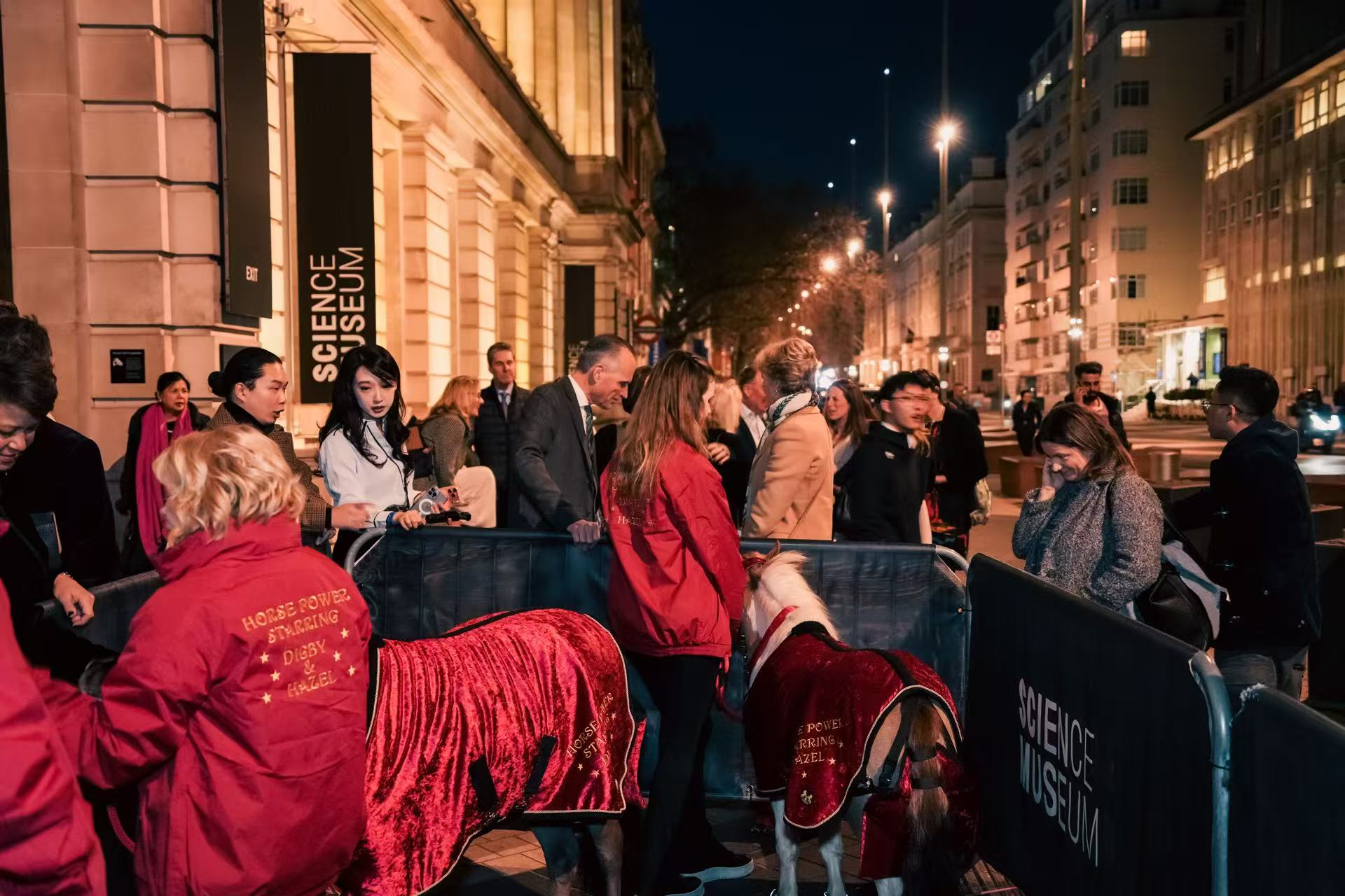 首映當晚,兩匹可愛的迷你馬現身博物館入口迎賓,成為現場一道獨特風景。閃光燈與交談聲交織,來自中英政治、文化、影視、學術及馬術界的賓客陸續入場,一場兼具藝術質感與跨文化意義的交流盛會正式啟幕。