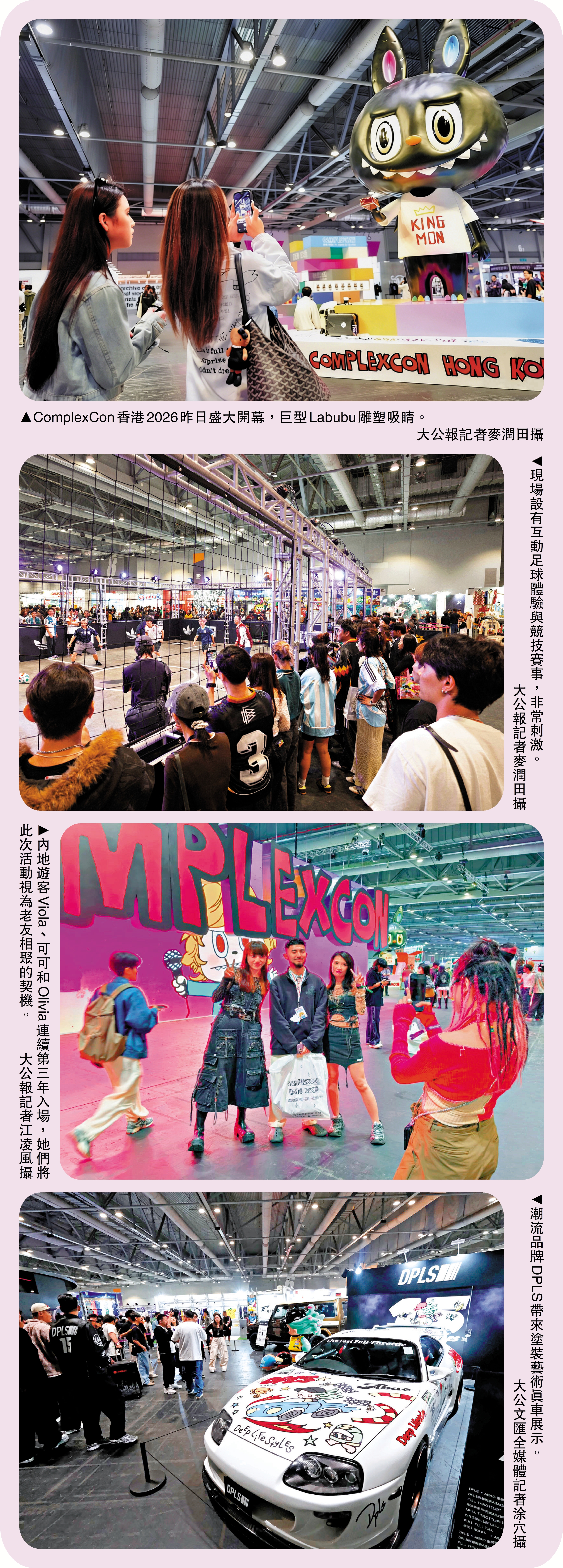 (大公報記者 戴靜文、江凌風)香港3月盛事停不了!國際潮流文化盛事「ComplexCon香港」昨日開幕,一連兩天在亞洲國際博覽館舉行。今年活動的藝術總監由香港藝術家龍家昇擔任,場內匯聚最新潮流、音樂、藝術等多種元素,150個潮流品牌攤位售賣限量產品、潮流玩具和服飾等,吸引大批「潮人」到場「朝聖」,有人提早一晚到場排隊等候。中國原創IP Labubu成為焦點,有旅客專程來港為搶購限量版Labubu,預計場內整體花費數萬元。