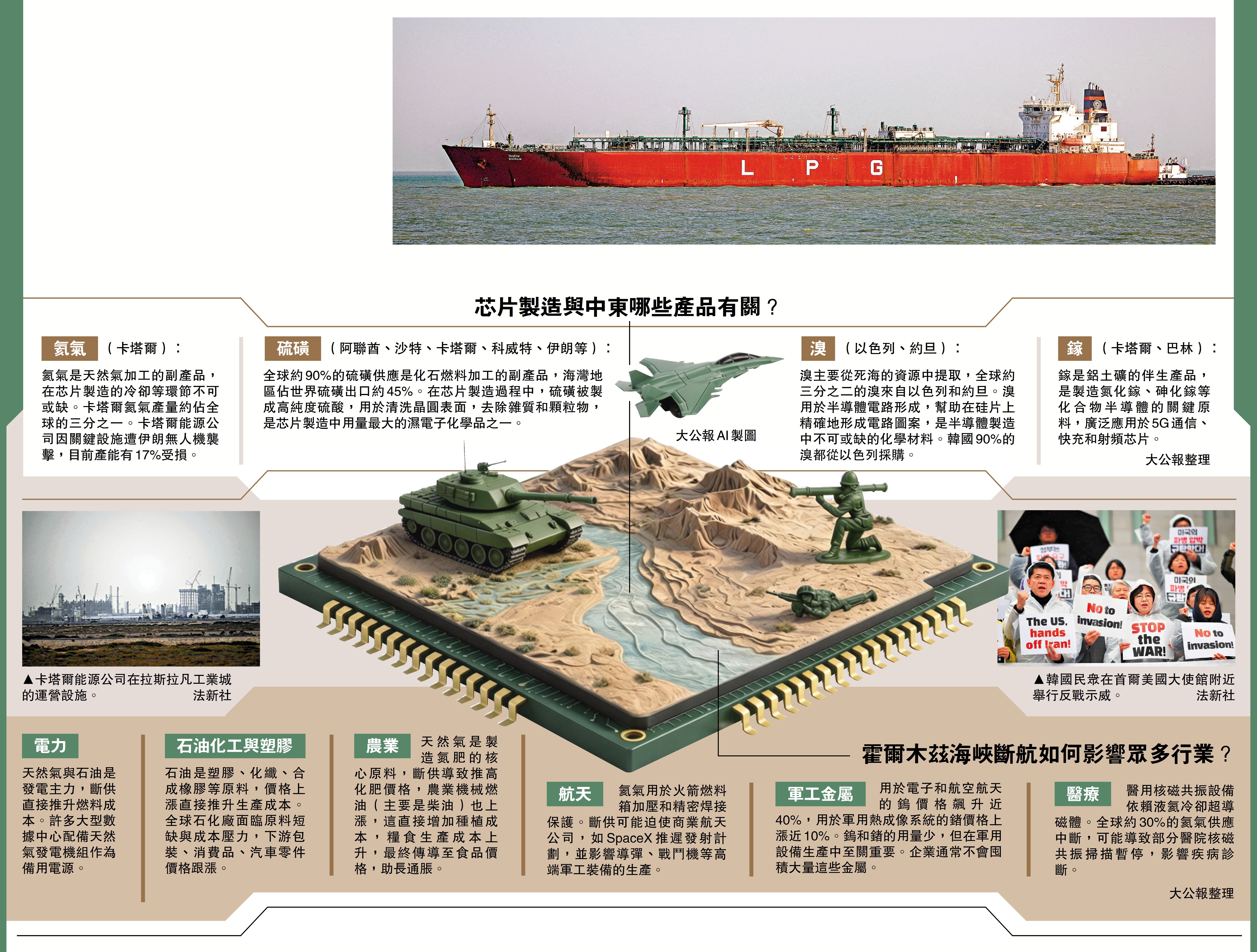 大公報報道,中東戰火延燒超過三周,霍爾木茲海峽航運幾近癱瘓,這條全球能源與工業原材料運輸的「咽喉」被扼制,引發能源價格飆升、關鍵原材料供應中斷及全球物流不暢,進而推高製造業成本,威脅到從汽車到半導體的多個行業生產。卡塔爾關鍵設施遇襲受損,出口產能大幅下降,嚴重威脅全球芯片製造與高科技產業的關鍵原材料供應。分析認為,若衝突長期化,將進一步推升製造業成本、引發供應鏈全面斷裂,多個產業生產面臨嚴峻挑戰。