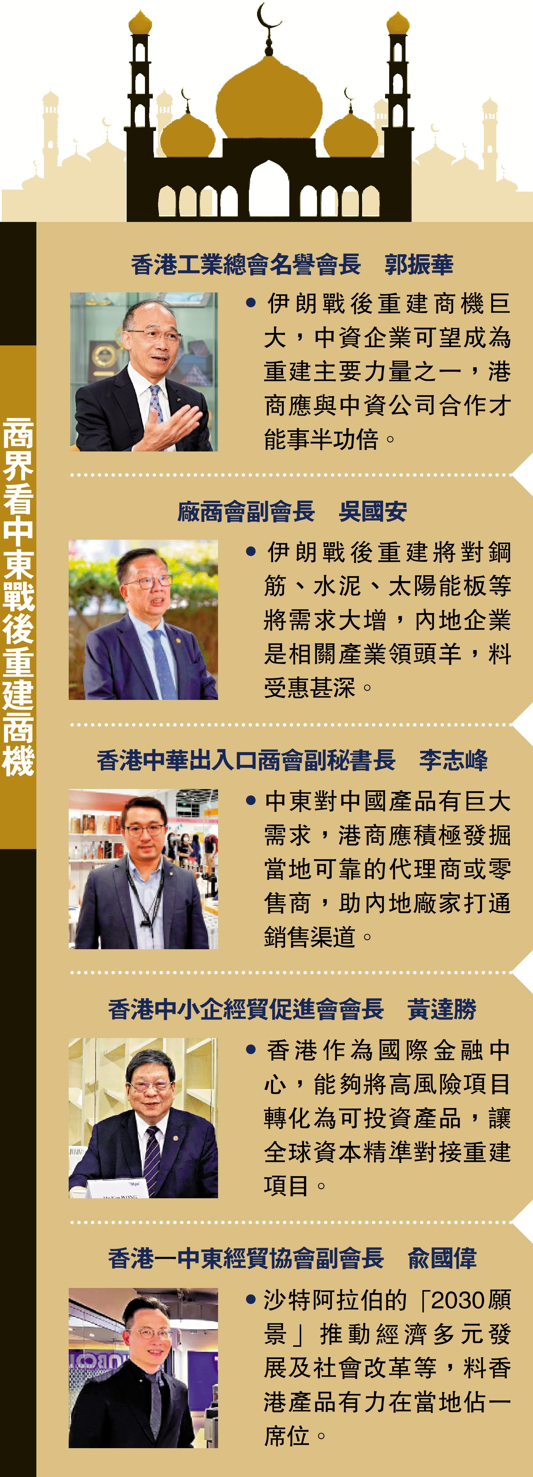 談及中東戰事,總令人想起的景象,除了各處頹垣敗瓦外,大多數人擔憂能源價格急升而拖累經濟。然而,縱橫商界多年、看盡風雲幻變的香港工業總會名譽會長郭振華及廠商會副會長吳國安腦海中,卻是一幅幅戰後重建的景象及當中的機遇。他們異口同聲指出,中東亂局少不免會有短期陣痛,但中、長期而言,卻是「危中有機」,更是機大於危,呼籲港商不要自亂陣腳,要耐心看待及為戰事平息後的市場復甦做好充分準備。