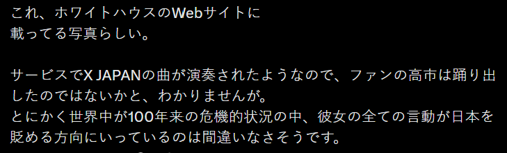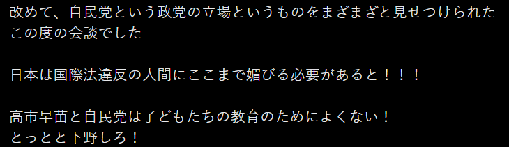 日本網友紛紛表示,高市早苗的行為令人無法容忍:「扭來扭去討好特朗普,真是令人作嘔。單憑這種行為就能看出,這個人是個粗俗的人,她一生都在討好男人,以求向上爬。」「高市早苗的無知正在全世界範圍被揭露。」「在全世界面臨百年未見的危機之際,她的一切言行都明顯是為了貶低日本。」