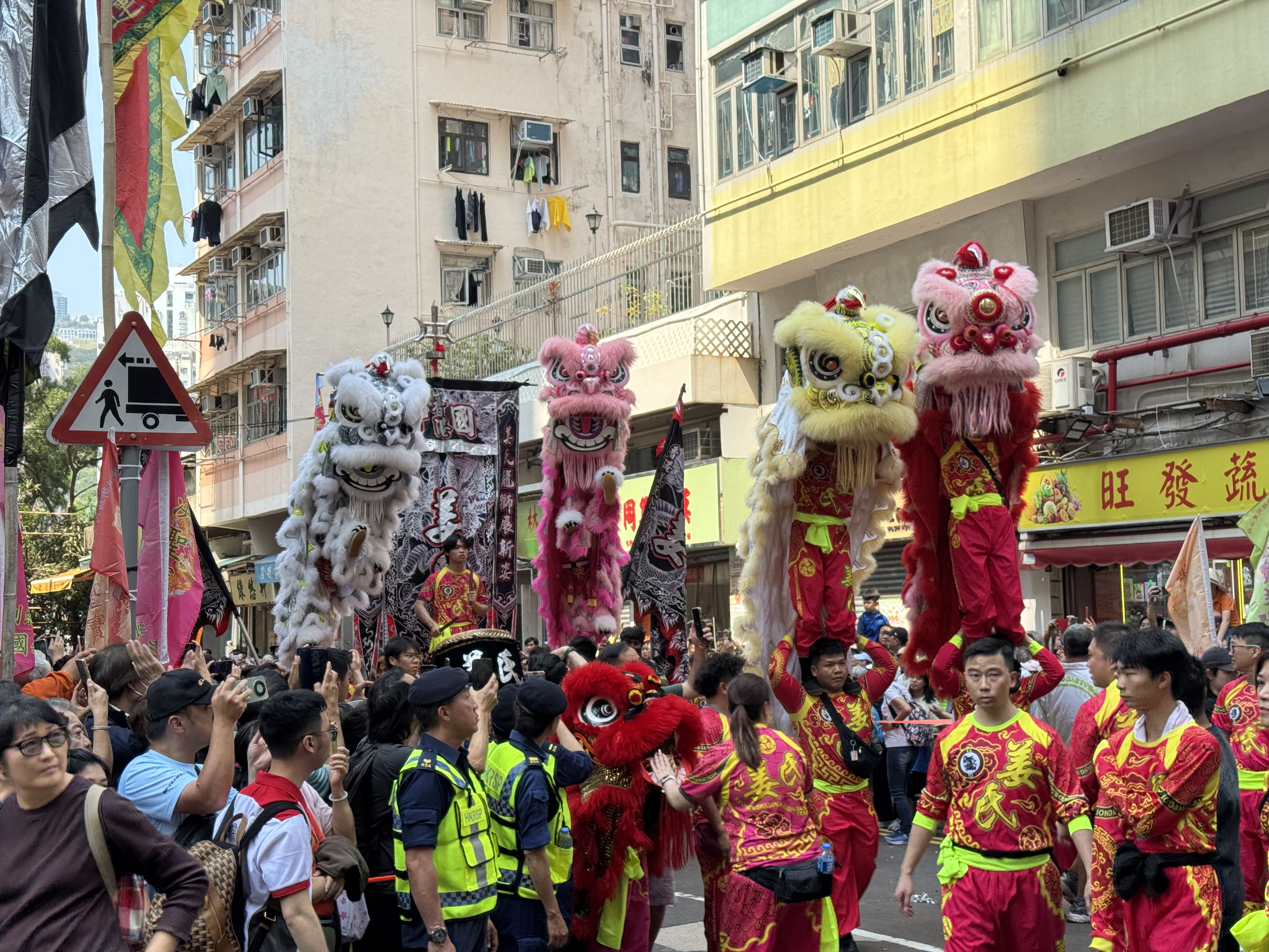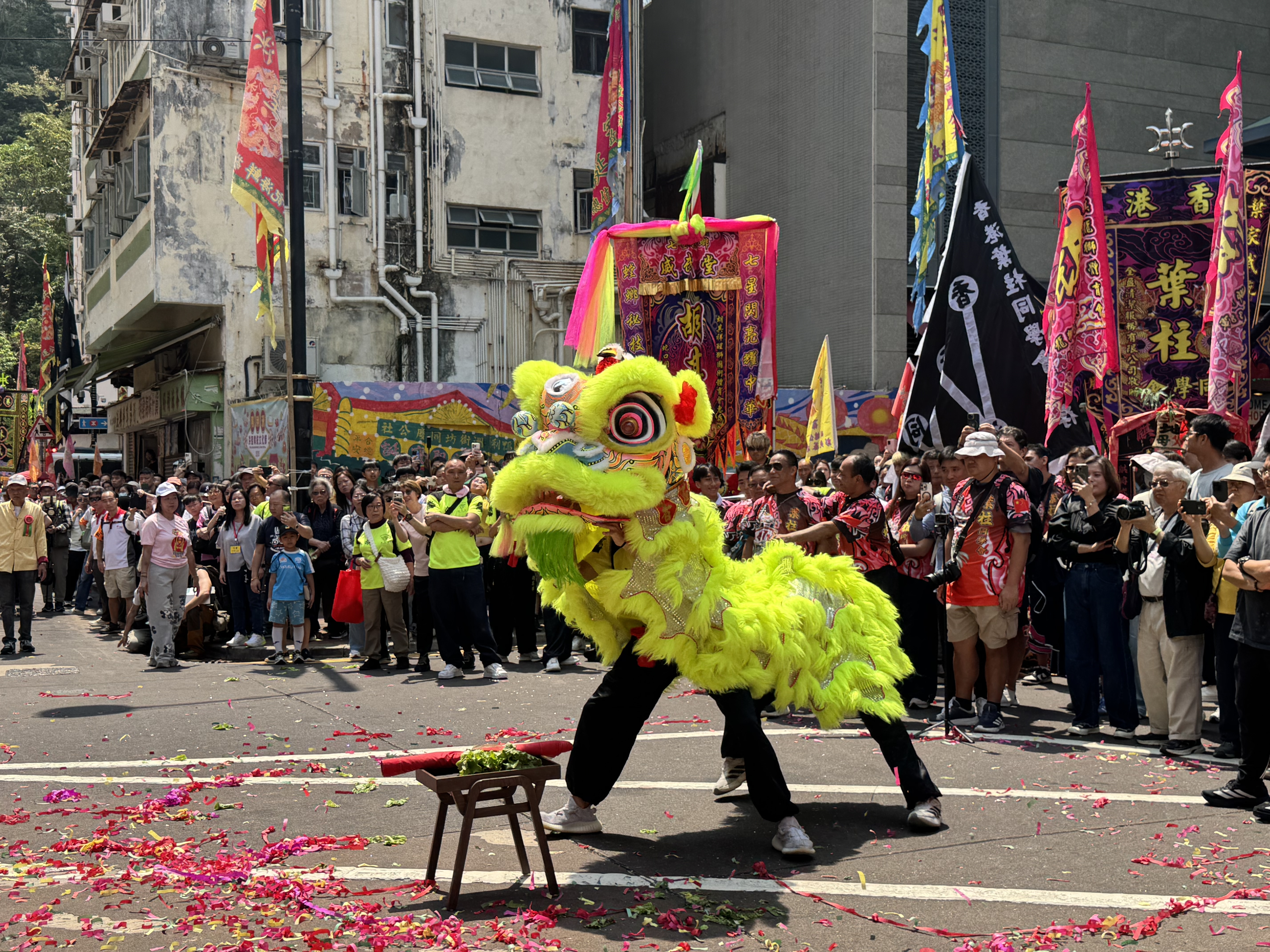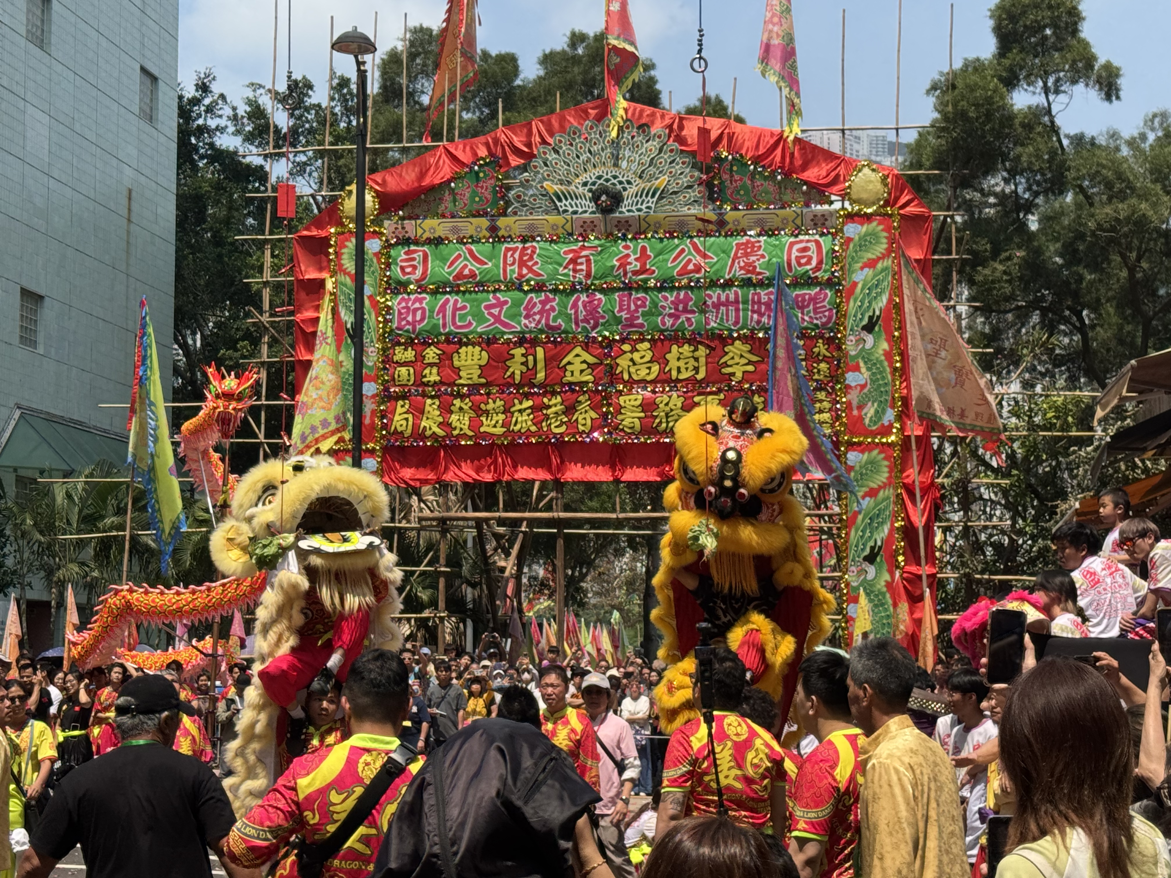 現場上演醒獅採青,各種顏色、裝飾各異的獅子搖頭擺尾,生動活潑,時而匍匐在地,時而揚起前腿四處眺望,尋找並摘下生菜,亦諧音「生財」,寓意招財進寶、生機勃勃。