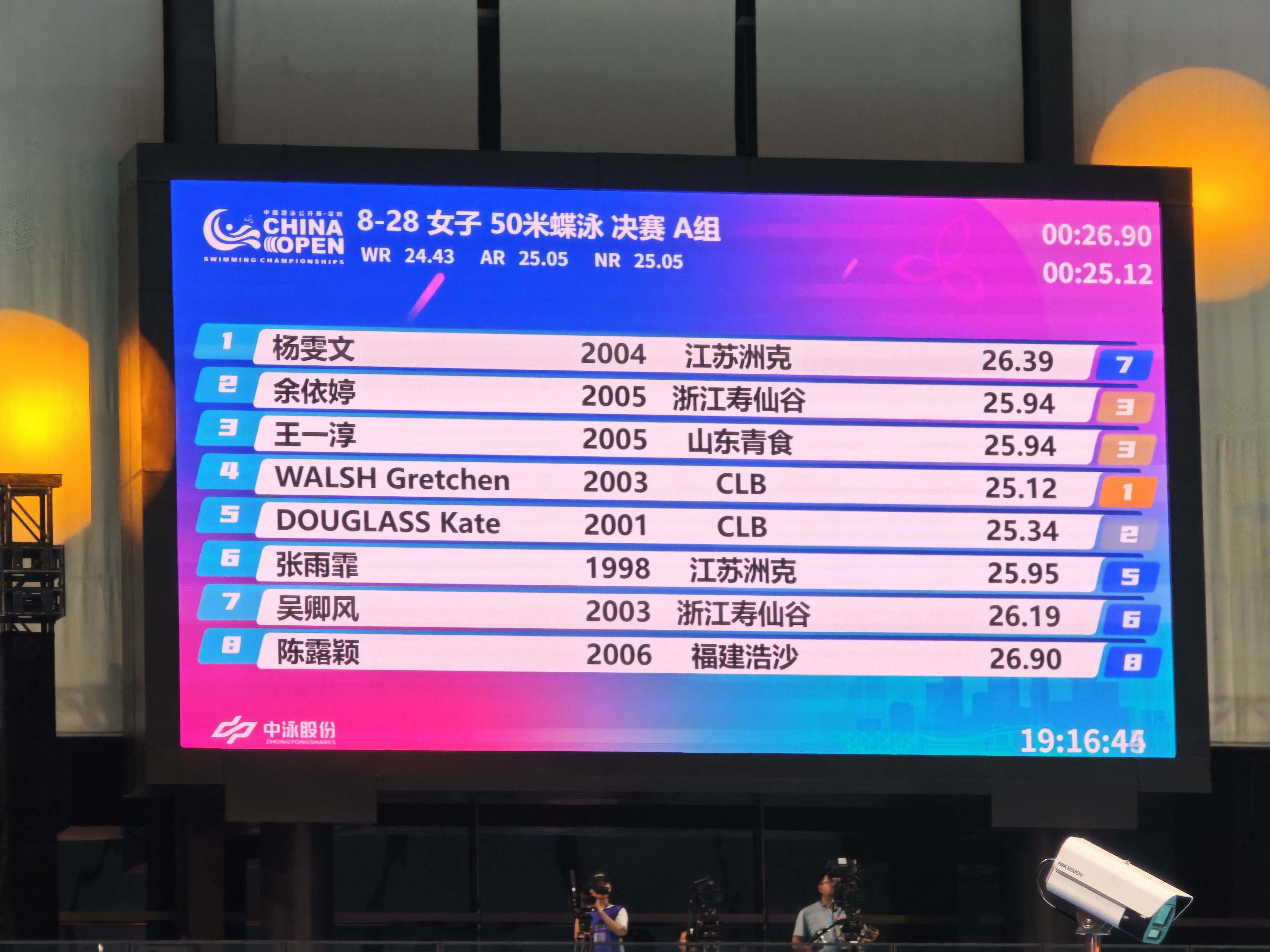 (大公文匯網 記者 李薇、胡永愛)3月22日,2026年中國游泳公開賽迎來收官之日。當晚,張雨霏參與的女子50米蝶決賽備受關注。張雨霏依舊和自己的勁敵泳格雷琴沃爾什、凱特道格拉斯同場競速。最終,格雷琴沃爾什以25秒12的成績斬獲金牌,凱特道格拉斯成績25秒34獲銀牌,山東王一淳與浙江余依婷並列第三名。張雨霏以25秒95的成績位列第五,在此次最後一個項目中無緣獎牌。