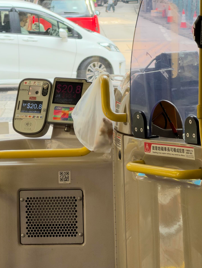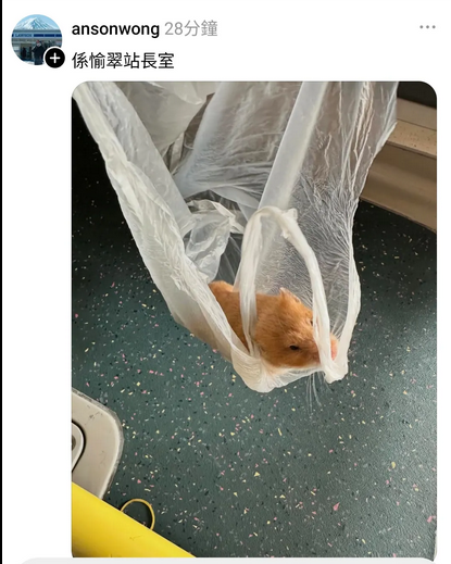 網民在社交平台Threads發文指,今早約10時左右乘搭九巴182路線,形容是「咁大個仔第一次」有幸在巴士車廂見到有疑似走失的倉鼠,躲在角落瑟縮不寧。網友最終捉起倉鼠放入膠袋,並在綁個結「留生口比鼠鼠唞氣」,暫時袋住交給車長處理。根據網民分享的短片可見,倉鼠被放在透明膠袋並掛在車長司機位的扶手。該網民搞笑表示,「我全身上下除咗肝膽相照、義氣風雲、帶點戇直之外,多出嚟嘅只有膠袋一個」,強調已經盡最大努力令倉鼠受驚程度減至最低。事主發帖文希望主人見到盡快將倉鼠接回家。