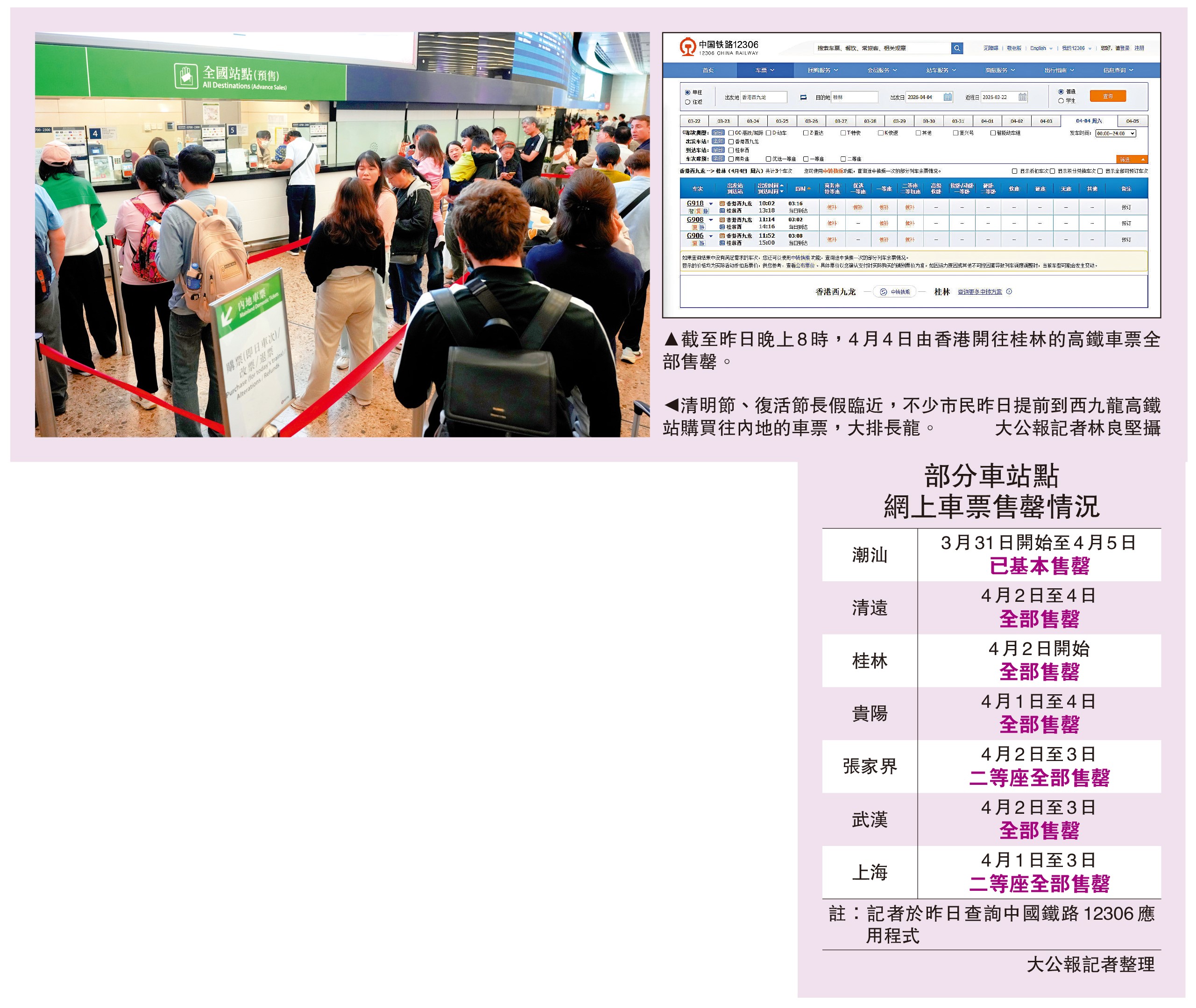 大公報記者昨日下午查詢高鐵12306應用程式,發現4月5日的車票已開始發售,並查詢到熱門旅遊地點的車票,當中假期首天的車票最搶手,4月3日起由香港出發至上海、長沙、成都、貴陽等城市的各類車票均顯示售罄,僅可等待候補。