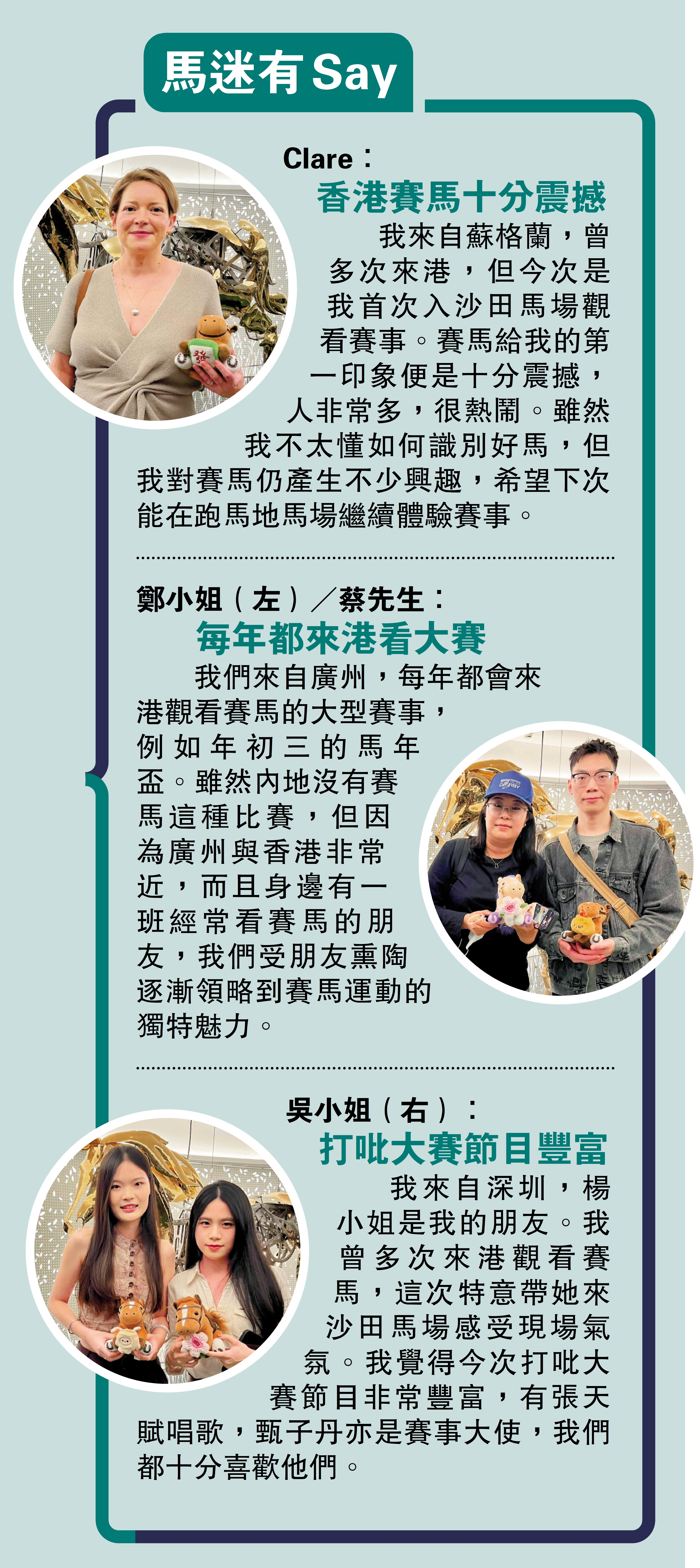 (大公報 記者 朱家立)香港一年一度馬壇盛事香港打吡大賽22日在沙田馬場上演,連同跑馬地馬場的雙邊投注,兩個馬場合共吸引72528人入場,創打吡大賽歷來新高,投注額則錄得16.78億港元,是歷來香港打吡大賽第二高。其中內地及海外旅客人數逾11600人,較去年同期增加約27.8%,刷新打吡大賽旅客入場人數紀錄,成為推動香港賽馬旅遊發展的亮眼一筆。作為香港旅遊發展局3月至4月「Hong Kong Mega 8」8項大型活動系列的揭幕盛事,此次打吡大賽充分展現香港作為「亞洲盛事之都」的澎湃活力與國際影響力。