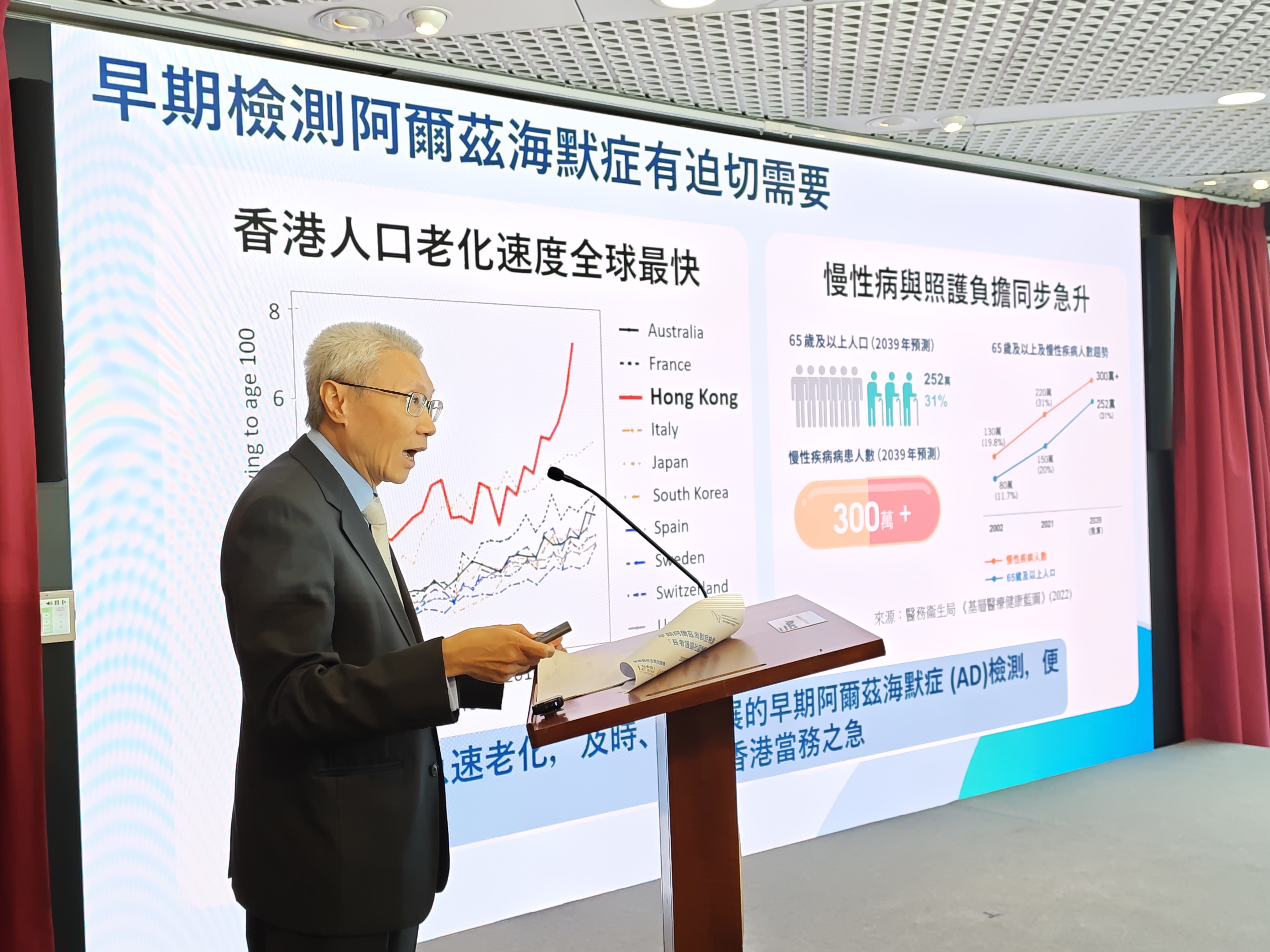 香港科技大學生命科學部臨床教授莫健英指出,本港正面臨嚴峻的人口老化挑戰,其中阿爾茲海默症患者數目急升。他說,預計到2039年,社區內將有約30萬名患者,接近整個將軍澳區的人口,若不及時介入,恐將對未來醫療體系帶來沉重負擔。