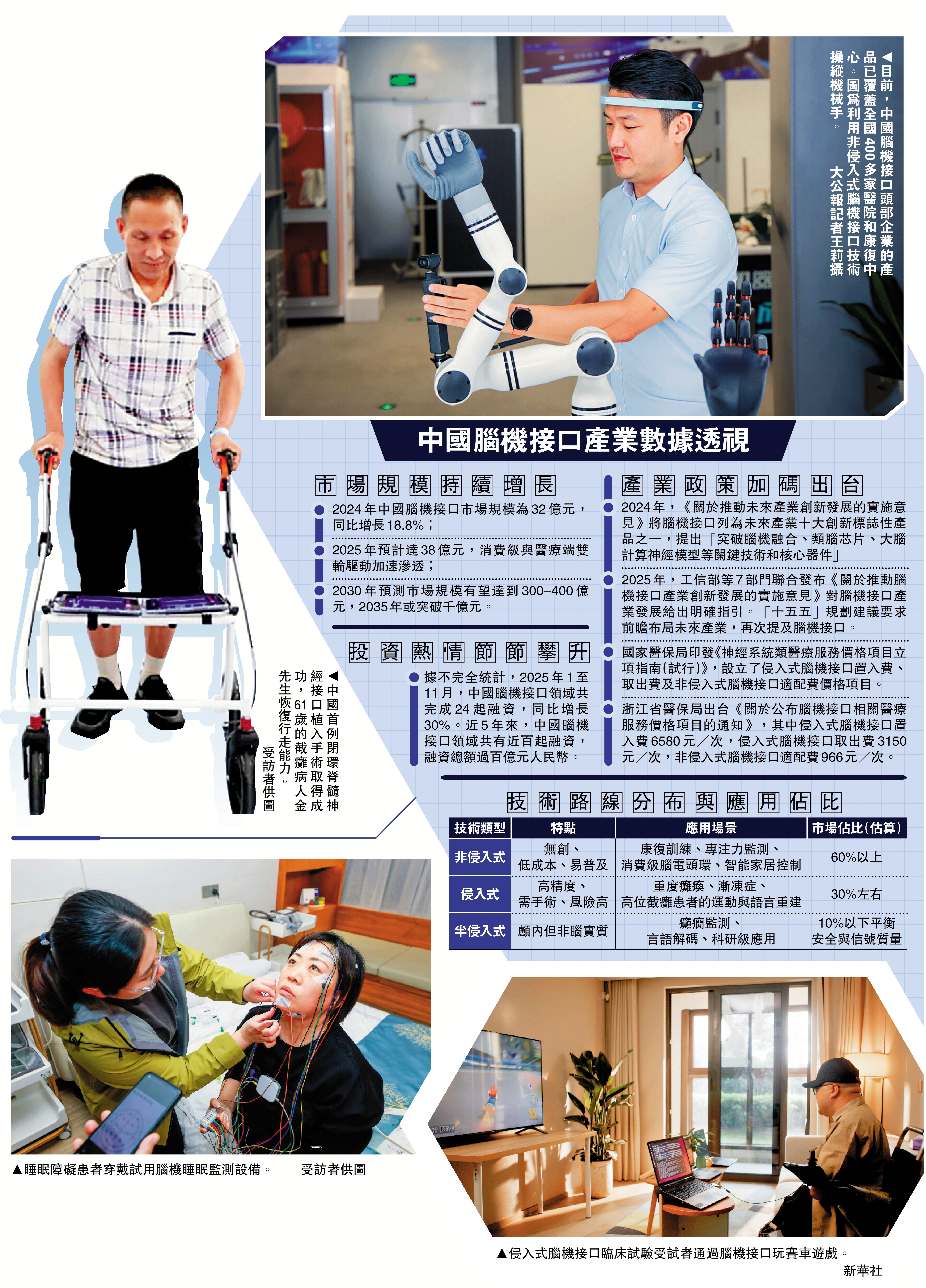 (大公報記者 王莉)用意念控制行動,完全性截癱者恢復自主行走,癲癇、阿爾茲海默症等被不可逆腦部疾病患者也可重獲新生……「腦機接口」,這個充滿科幻的詞彙,在今年政府工作報告中首次寫入,這標誌着該技術商業化落地將提速。「十五五」規劃綱要也提出,前瞻布局未來產業,推動量子科技、生物製造、氫能和核聚變能、腦機接口、具身智能、第六代移動通信等成為新的經濟增長點。2025年中國腦機接口市場規模預計達38億元,2030年有望達到300至400億元。