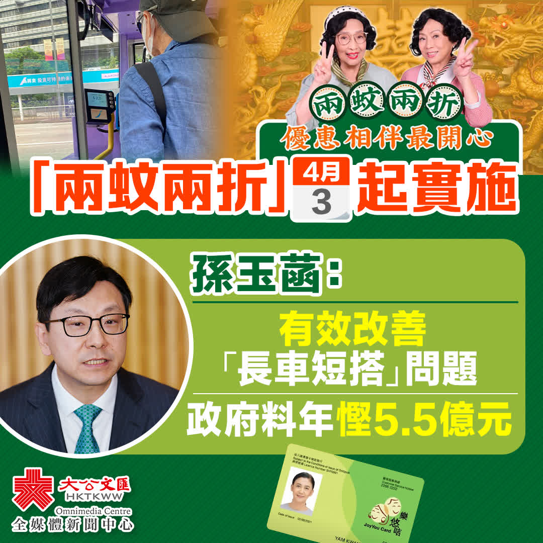 孫玉菡表示,「兩蚊兩折」可優化資源,有效改善長車短搭的問題,以中西區為例,現時有長者原可以搭乘區內10蚊以下的巴士,但因通通2蚊的優惠會搭乘過海的長程巴士。新計劃推出後,長者將會精打細算,選擇其真正有需求的車,而長程巴士則更多留給需要過海返工及上學的人搭乘。