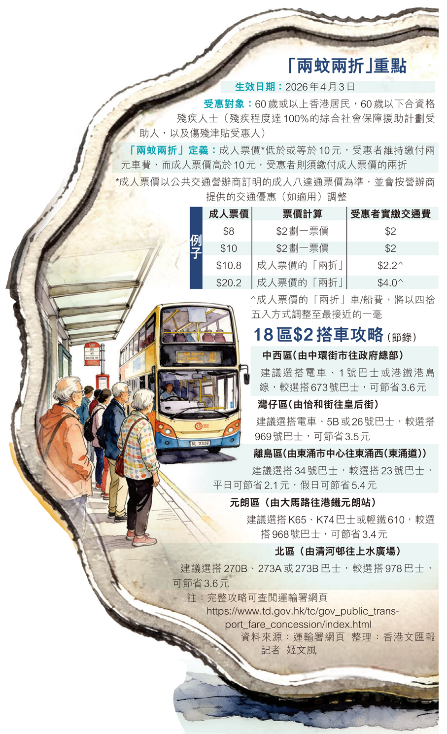 另外,運輸署網頁亦更新了「兩蚊兩折」的詳情,強調2元優惠計劃的受惠對象維持不變,合資格受惠者可使用樂悠咭或「殘疾人士身份」個人八達通繼續享受乘車優惠。網頁並上載了「兩蚊兩折」實施之後的18區「兩蚊」搭車攻略,舉例如受惠者從中環街市乘車去政府總部,建議選擇電車、1號巴士或港鐵港島線,可維持2元車費,但如乘搭673號巴士則會多花3.6元。