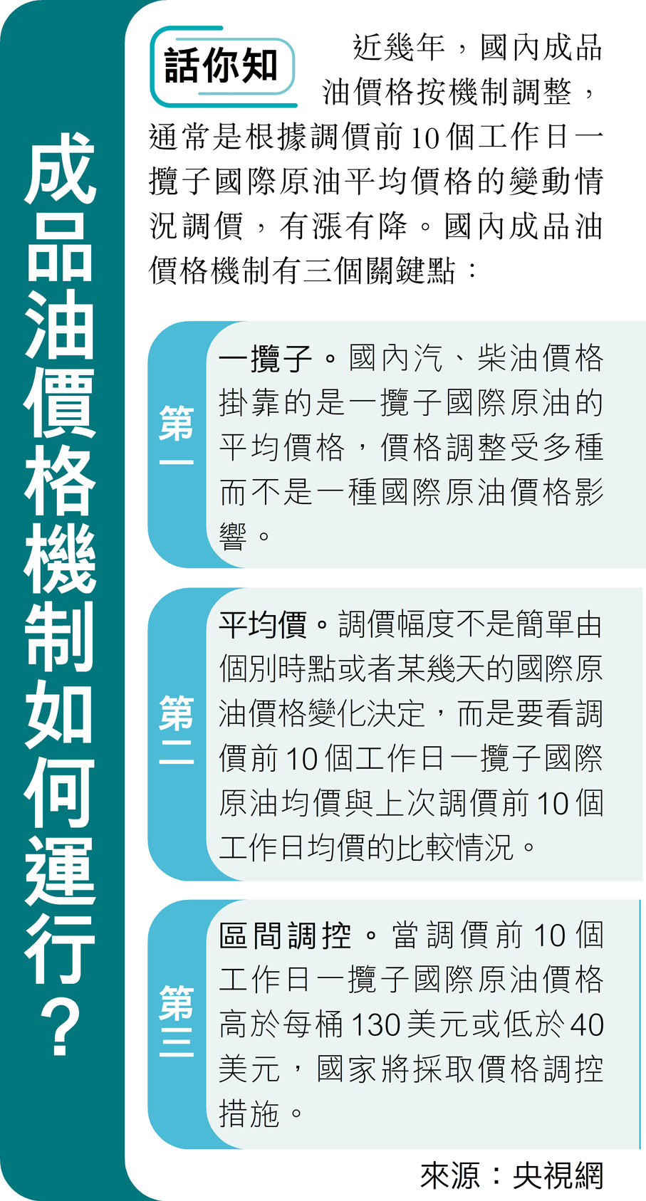 國家發展改革委價格成本和認證中心副處長呂指臣表示,現行國內成品油價格機制設置了每桶130美元的價格調控上限,如果一攬子國際原油的平均價格繼續大幅上漲,超過每桶130美元,也就是對應的國內成品油價格(92號汽油平均零售價格)略高於每升10元,將觸發價格調控上限,對於超出上限的部分,國內汽、柴油最高零售價格將不提高或少提高,同時為了穩定供應,國家可能會採取一些財稅支持政策。從以往情況看,2022年俄烏衝突曾引發國際油價大幅上漲,國家當時明確當國際油價突破每桶130美元的調控上限後,國內成品油價格短期內不再上調,通常為不超過兩個月,並對煉油企業給予階段性補貼。