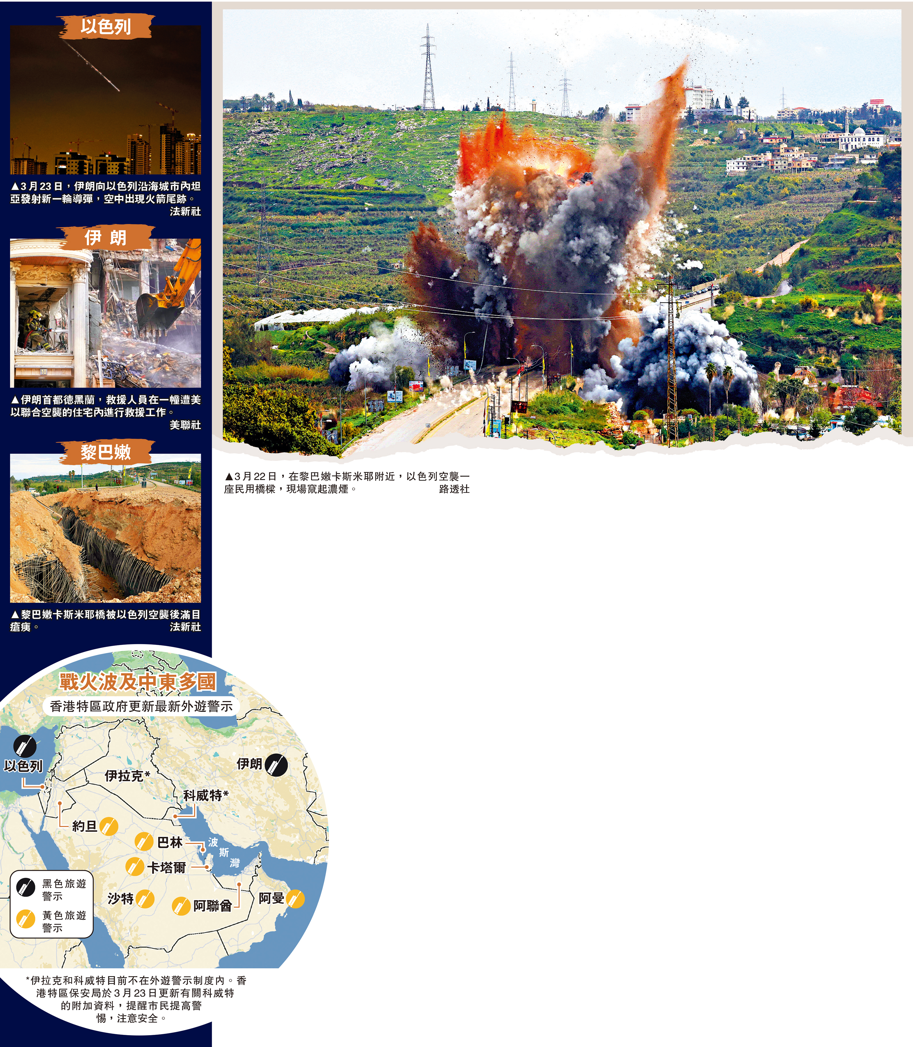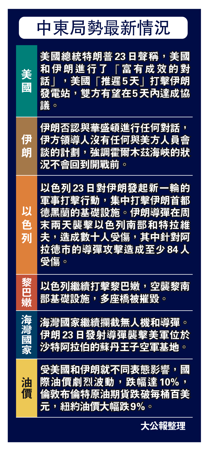 (大公報 記者 郭嘉)中東戰局,撲朔迷離,戰火繼續燃燒。美國總統特朗普22日向伊朗發出48小時的最後通牒,23日突然稱美伊雙方進行了良好且富有成效的對話,美軍對伊朗能源設施的襲擊將推遲5天,雙方有可能在5天之內達成協議。伊朗方面則否認雙方進行任何對話。分析認為,鑒於美、伊雙方對於談判的表態差異巨大,特朗普一方可能對伊朗進行極限施壓,以期望達成協議,盡快結束戰事。受中東局勢不明朗影響,香港特區政府23日提升伊朗及以色列的外遊警示級別至黑色,並向卡塔爾、沙特及阿聯酋等6個中東國家發出黃色外遊警示。