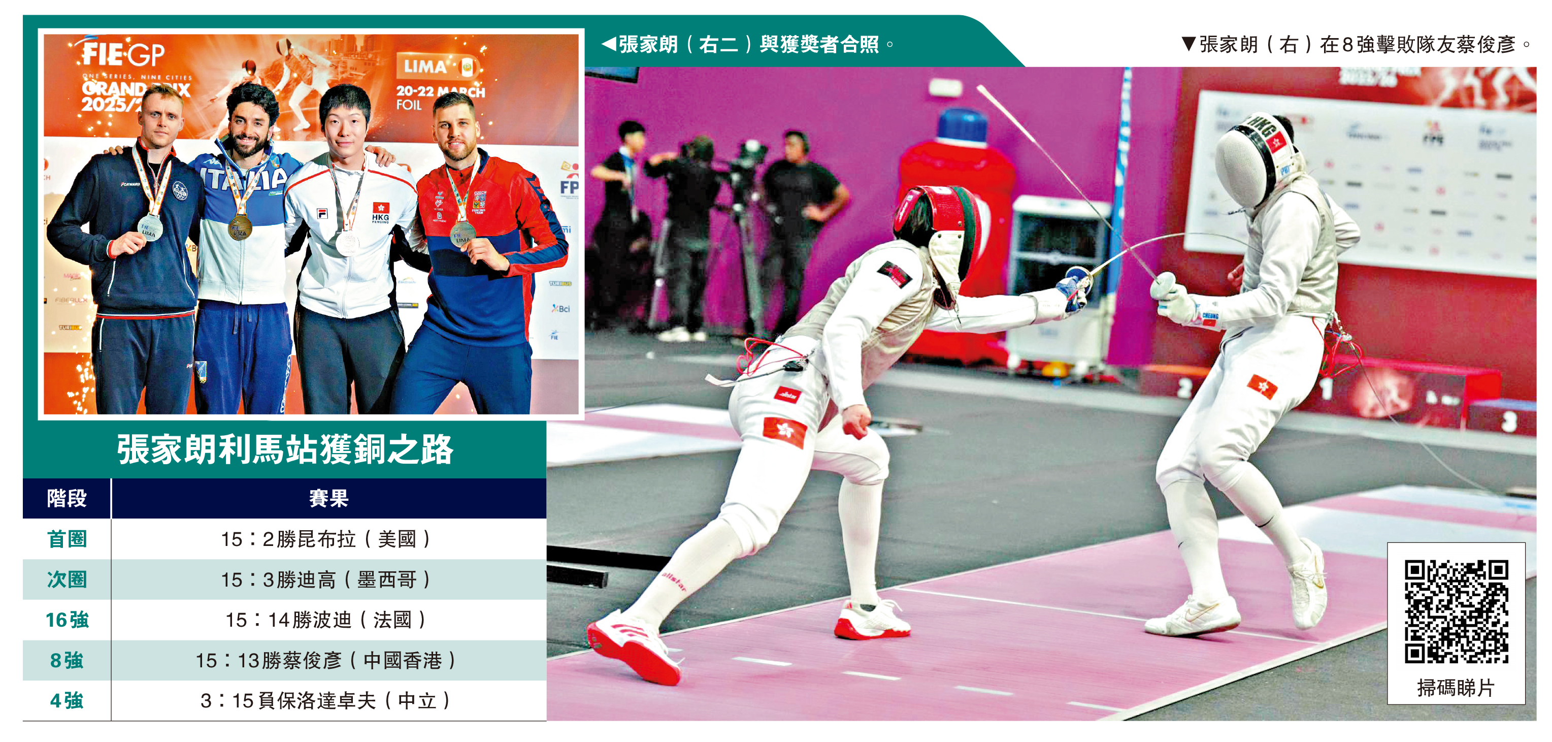 (大公報 記者 朱家立)男、女子花劍大獎賽3月20日至22日在秘魯的利馬上演,中國香港花劍名將張家朗與隊友蔡俊彥分途出戰,最終兩人在8強相遇,張家朗結果以15:13贏出「港隊打吡」。不過,張家朗在4強以3:15不敵中立選手保洛達卓夫,在不設季軍戰下,繼上月都靈站後再次並列銅牌。另一港隊小將何承謙則於8強以13:15不敵意大利的比安基,取得個人歷來的最佳成績。