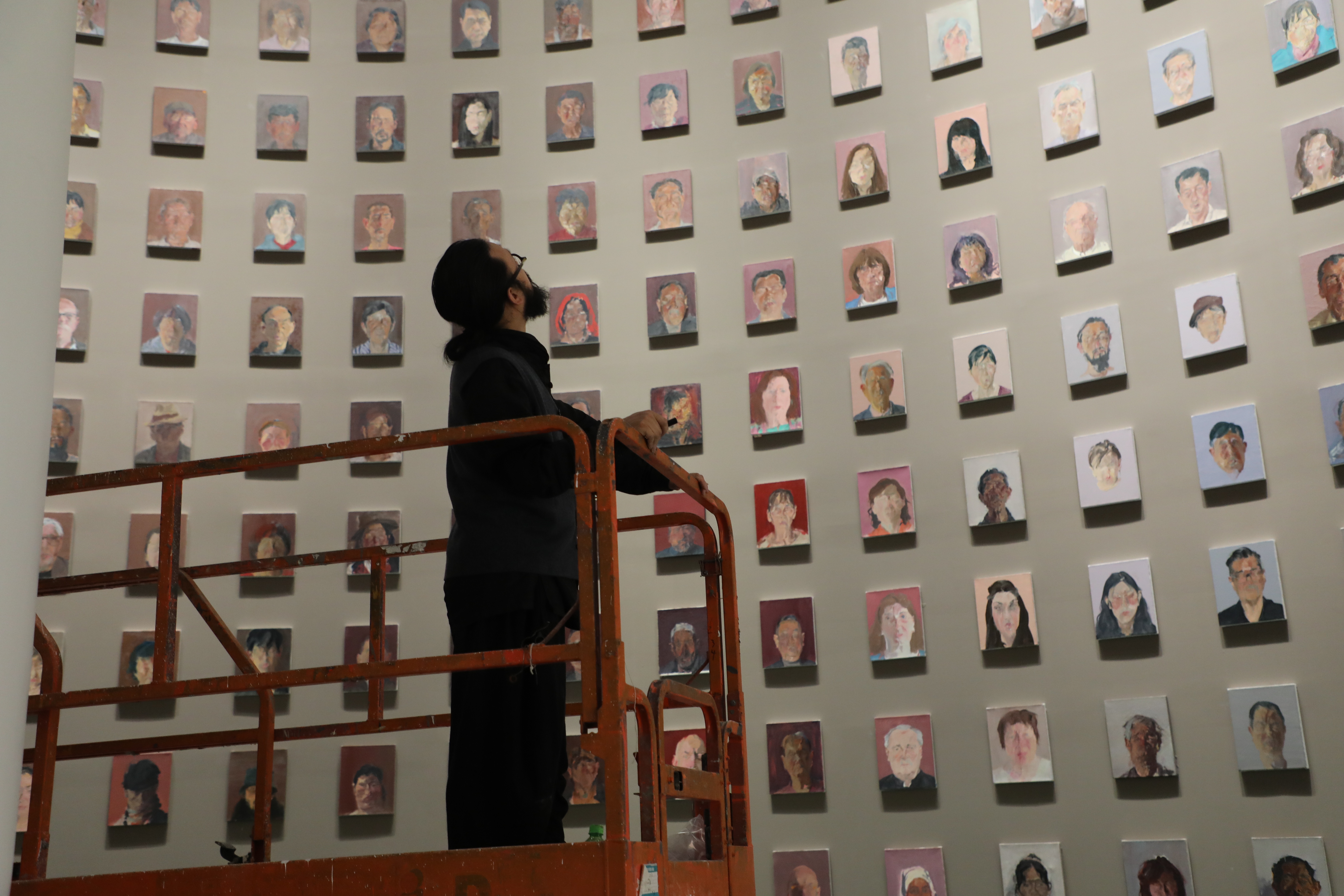 展廳中心為此次展覽的核心部分:13米的圓柱體空間內,1000餘幅面孔排列如「千佛洞」。這種極致的陳設,意在去除表象、回歸本心——過去二十八年,童雁汝南堅持近乎苦行僧式的「修行」,不隨波逐流於當代藝術的潮流遊戲,而是通過無數次的「面對面」寫生,在方寸畫布間構建關於人類精神的微觀世界。圍繞核心展區,過道兩側呈現單幅肖像作品部分,與中心「無相」部分形成呼應。而在展廳深處的數字化影像區域,觀眾將聆聽到肖像模特的採訪感言,以及來自藝術界眾家的評述——這些聲音與畫面彼此交織,構成「無相」之外的另一重維度。