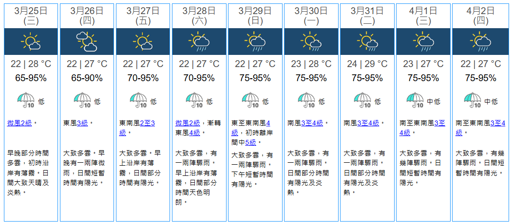 根據天文台最新九天天氣預報,未來九日氣溫介乎22度至29度,濕度維持65%至95%。明日(3月25日)日間大致天晴及炎熱,早晚部分時間多雲,初時沿岸有薄霧。由本周六(3月28日)至下周四(4月2日)一連六日,預計天氣大致多雲,有一兩陣驟雨或有幾陣驟雨。