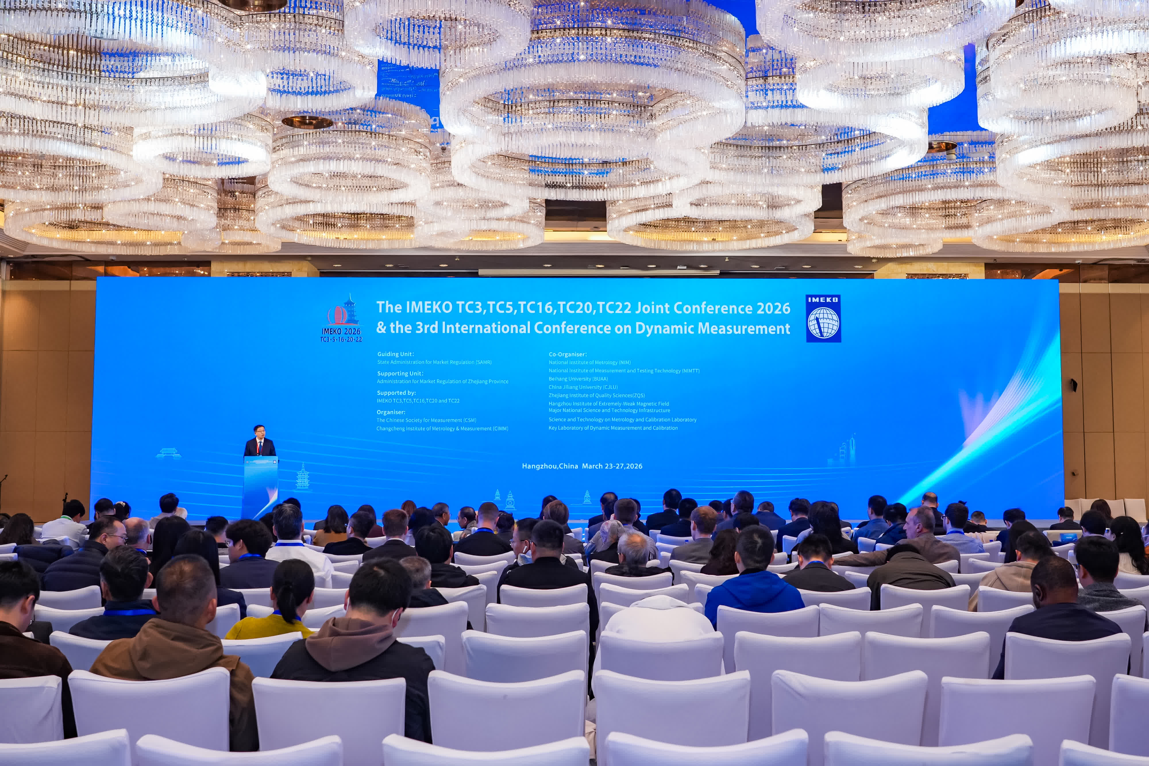 24日,國際測量技術聯合會相關技術委員(TC)——TC3、TC5、TC16、TC20及TC22聯合會議暨第三屆動態測量國際會議在浙江杭州開幕。國家行業主管部門領導、國內外院士、知名計量機構和相關領域的專家學者,來自30餘個國家與地區、80餘家研究機構500餘名代表共聚一堂,共商計量科技創新發展,共促全球測量領域交流合作。