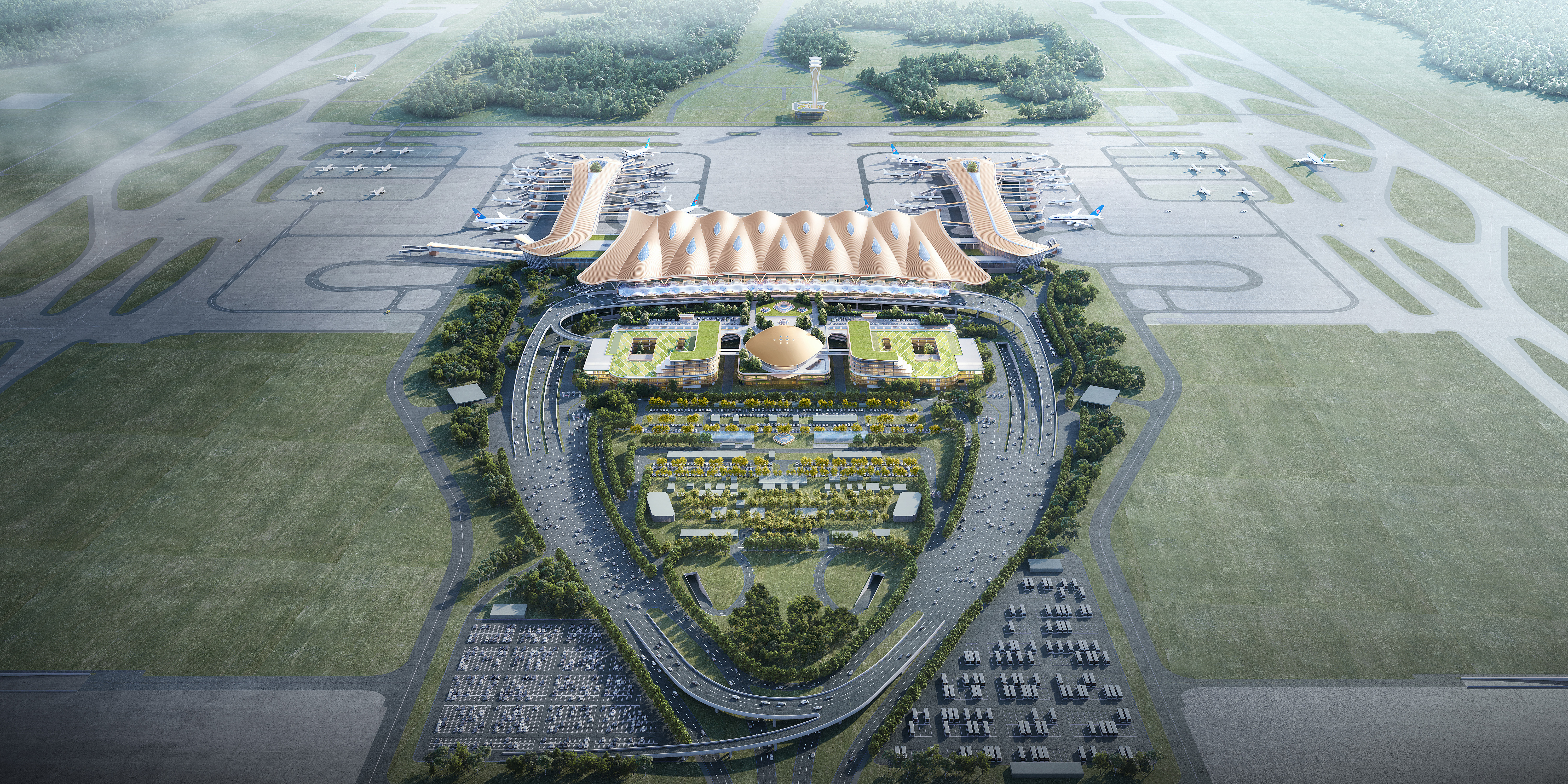 廣州新機場在設計上深度融合「嶺南文化」與「四型機場」建設要求,從佛山祖廟、龍舟、醒獅等傳統文化元素中汲取靈感,採用六指廊構型與流線型交錯拱屋頂,既高效利用站坪空間,又蘊含「千龍競發」與「雄獅醒耀」的時代寓意,將成為彰顯嶺南文化自信的門戶地標。