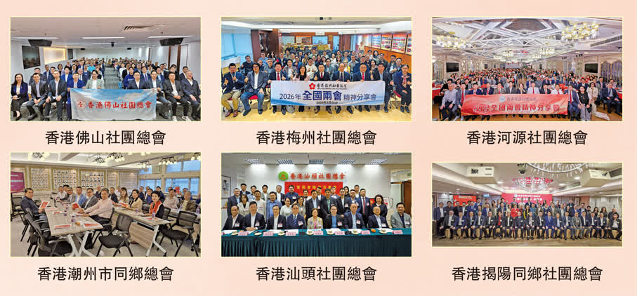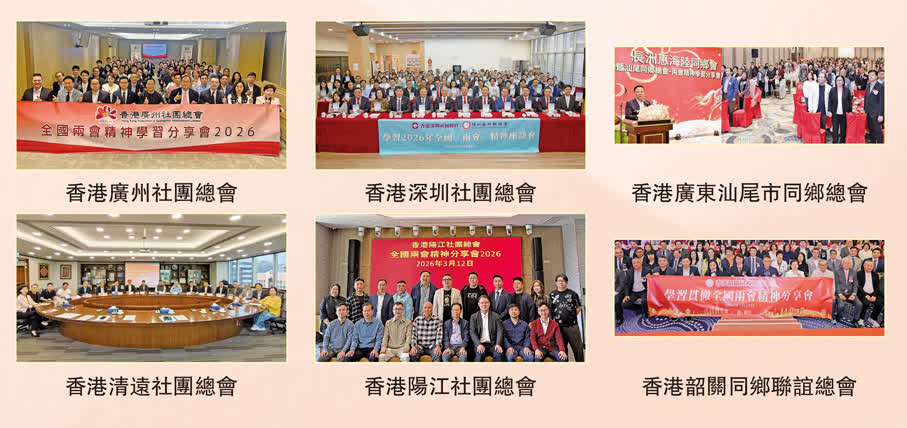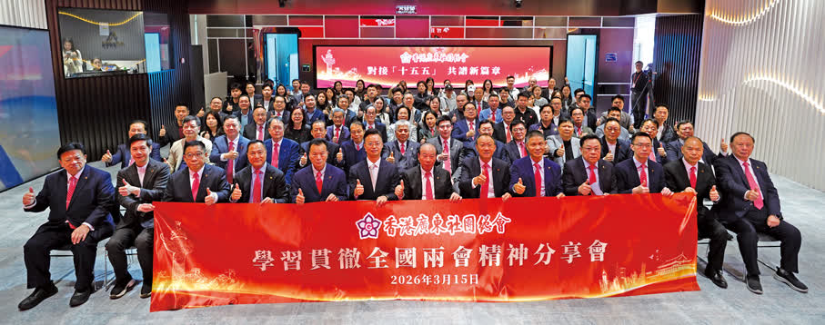 3月15日,香港廣東社團總會假灣仔灣景中心潤維創坊舉辦「學習貫徹全國兩會精神分享會」,全國政協常委、總會主席龔俊龍,全國政協教科衞體委員會副主任、總會第一執行主席鄧清河,廣東省政協常委、總會執行主席張廣軍,全國政協委員、總會執行主席黃少康,全國政協委員、總會常務副主席兼秘書長吳華江,全國政協委員、總會總顧問張國榮分別於會上就今年兩會的焦點議題作宣講分析,並從不同角度分享學習兩會精神的心得體會。全國人大代表、總會常務副主席鄺美雲、徐莉及副主席陳曉峰,全國政協委員、總會名譽主席吳傑莊及常務副主席高佩璇、蘇長榮、黎俊東,總會常務副主席曾燈發、譚鎮國等,則透過與場內媒體的互動交流,暢談學習並貫徹落實兩會精神的見解感受。大會特邀全國港澳研究會成員、「城市智庫」主席洪錦鉉擔任主講嘉賓,深入剖析「十四五」規劃成果與「十五五」規劃戰略目標的緊密關連,以及「十五五」規劃對香港未來發展的重大意義。