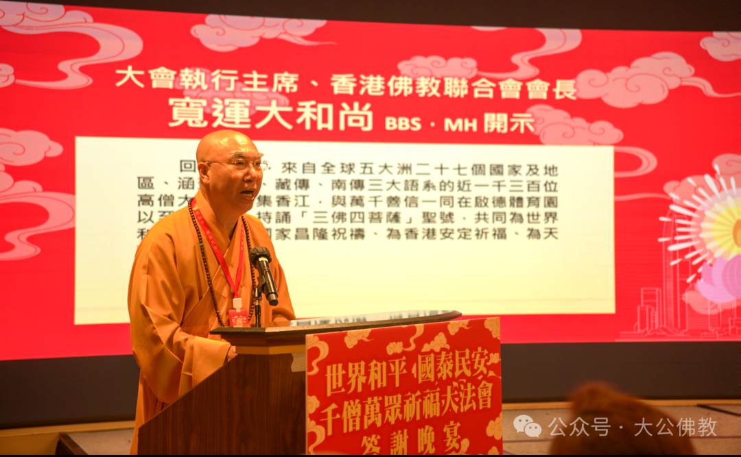 答謝晚宴上,寬運法師代表主辦方向鼎力支持活動的各界人士致以深切謝忱,並全面總結了法會順利圓滿的殊勝因緣。寬運法師在致辭中首先回顧了為期四天的「世界和平 國泰民安 千僧萬眾祈福大法會」及「盛世鳴鐘 福佑香江 除夕叩鐘」等活動。他表示,這不僅是香港佛教界前所未有的一次盛會,更是一場跨越宗派、種族與國界的宗教盛事,充分展現了佛教「無緣大慈,同體大悲」的精神,以及香港作為中外文化薈萃的國際大都會的非凡魅力。