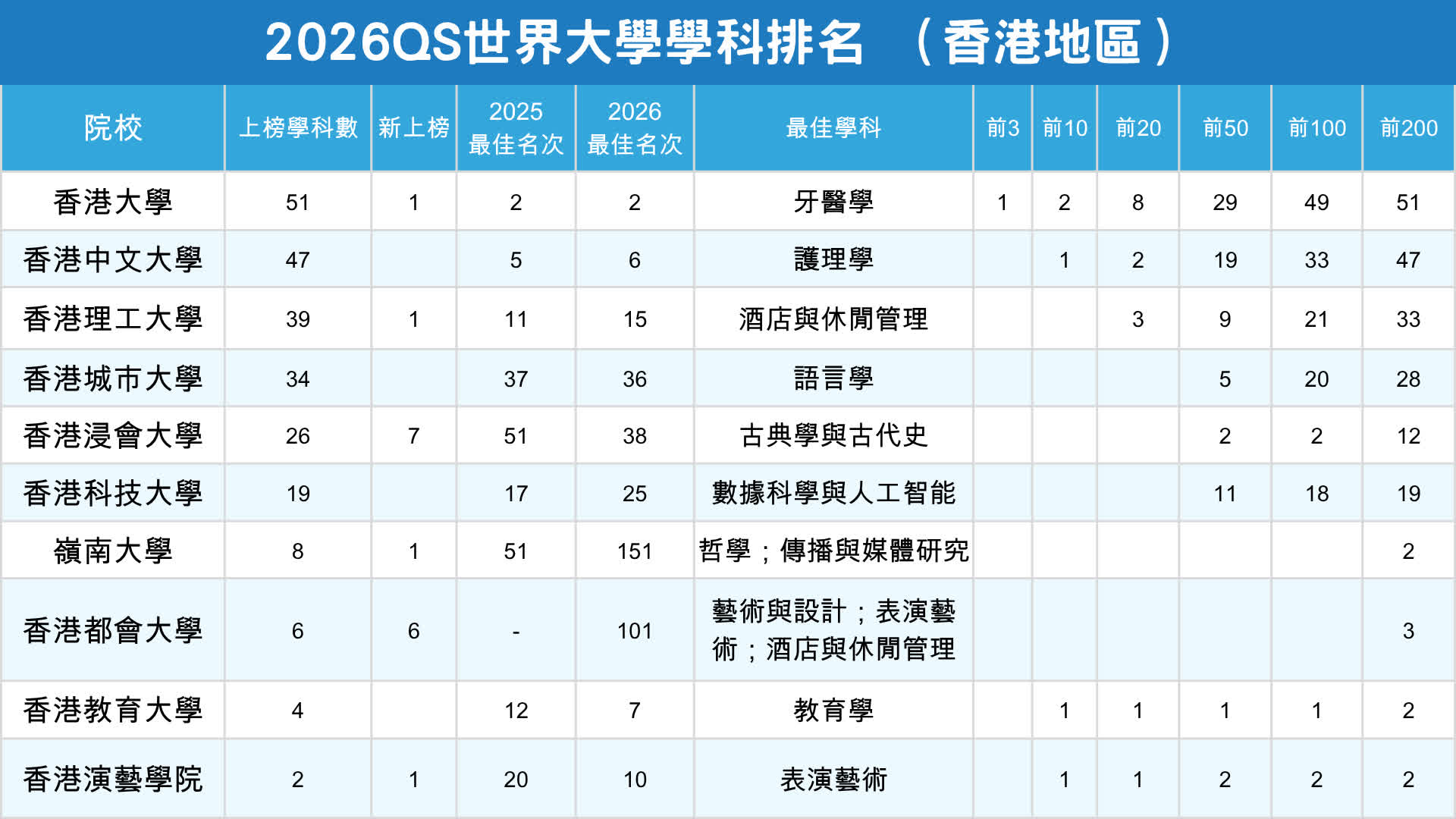(大公文匯全媒體 記者 莫楠)特區政府近年積極鞏固香港國際教育樞紐的地位,本港專上院校在國際排名屢創佳績。國際高等教育機構QS今日(25日)公布2026年世界大學學科排名,香港整體表現亮眼:本港今年有5個學科躋身全球首10位,較去年少1科。其中,港大牙醫學繼續排名最高,位列全球第2。演藝學院的表演藝術躍升10位,排名第10位,為首次打入首10位。