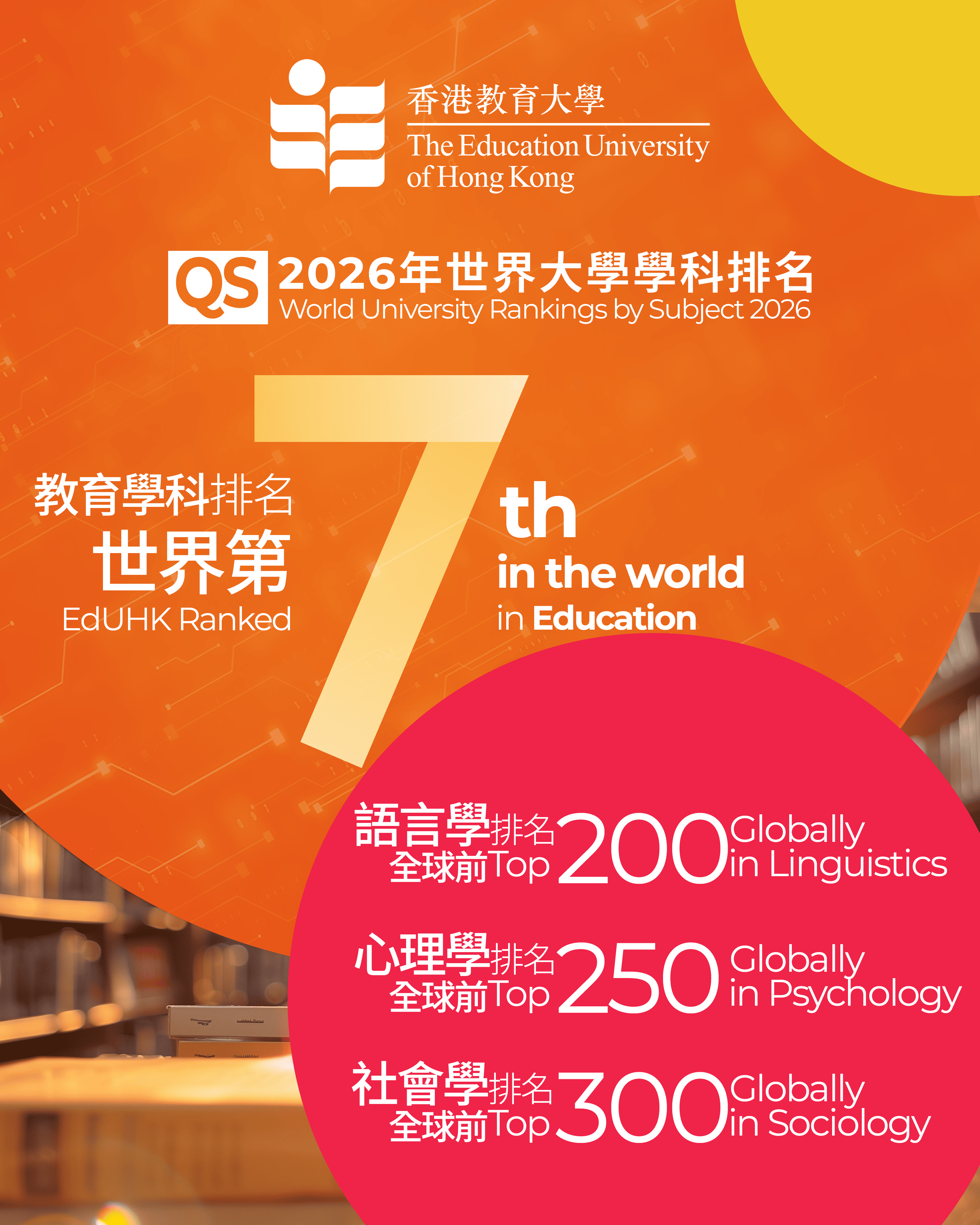 除教育學科表現卓越外,教大另有三個專業學科亦在國際排名中穩佔一席,包括語言學位列全球前200, 心理學位列全球前250,以及社會學位列全球前300。此外,教大亦首次在「藝術與人文」及「社會科學與管理」兩大學科領域躋身排名,不但突顯本校在多個學科的實力持續提升,更展現出其超越教育、推動多元發展的綜合優勢。