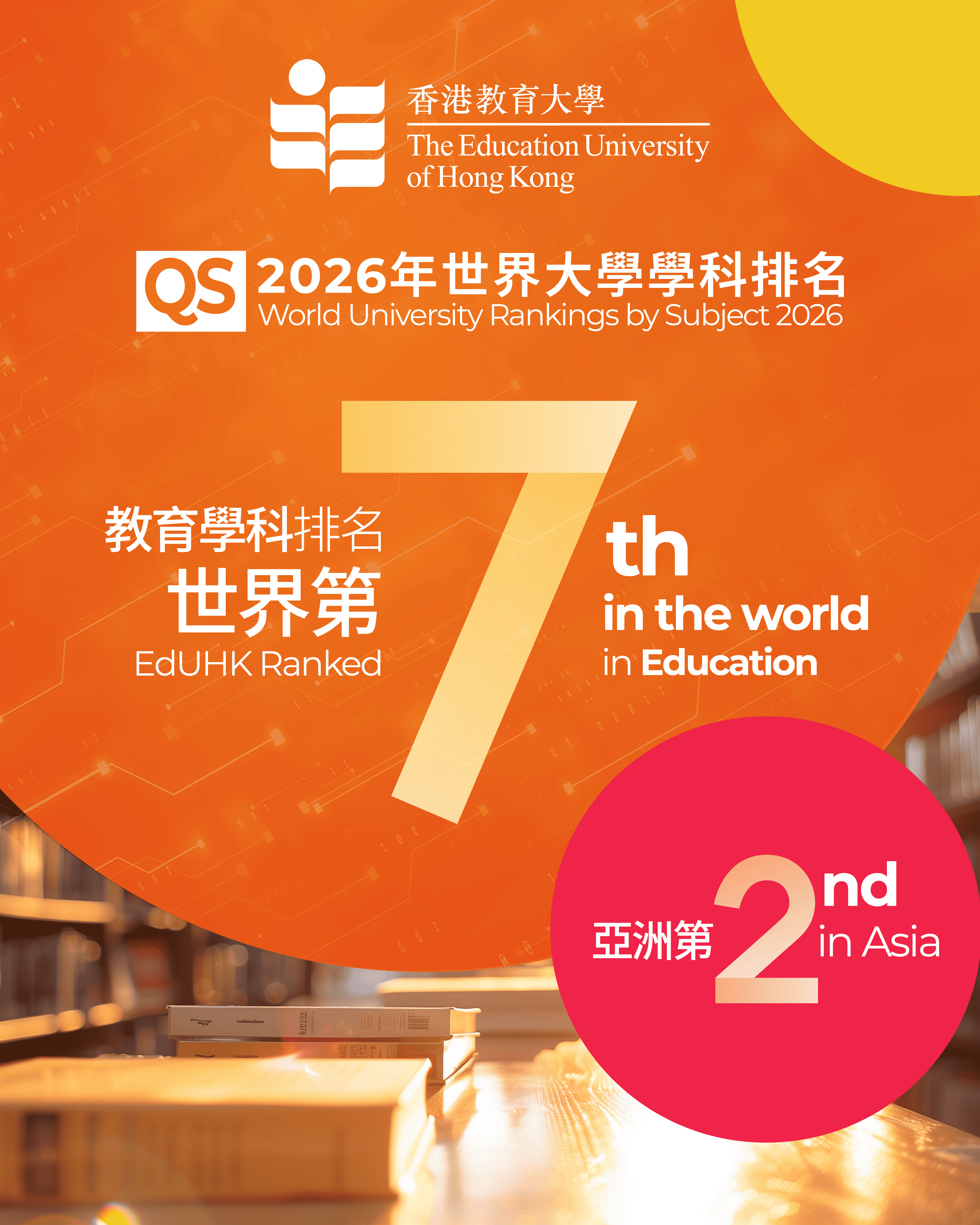 香港教育大學(教大)今天(3月25日)欣然宣布,教大的教育學科於最新公布的《2026 QS世界大學學科排名》中,躍升至全球第七位、亞洲第二,創下歷史新高,成績令人鼓舞。連續三年的進步,成為教大發展的重要里程碑,亦進一步彰顯教大在教育領域的專業地位,受到國際學術界高度認可與肯定。