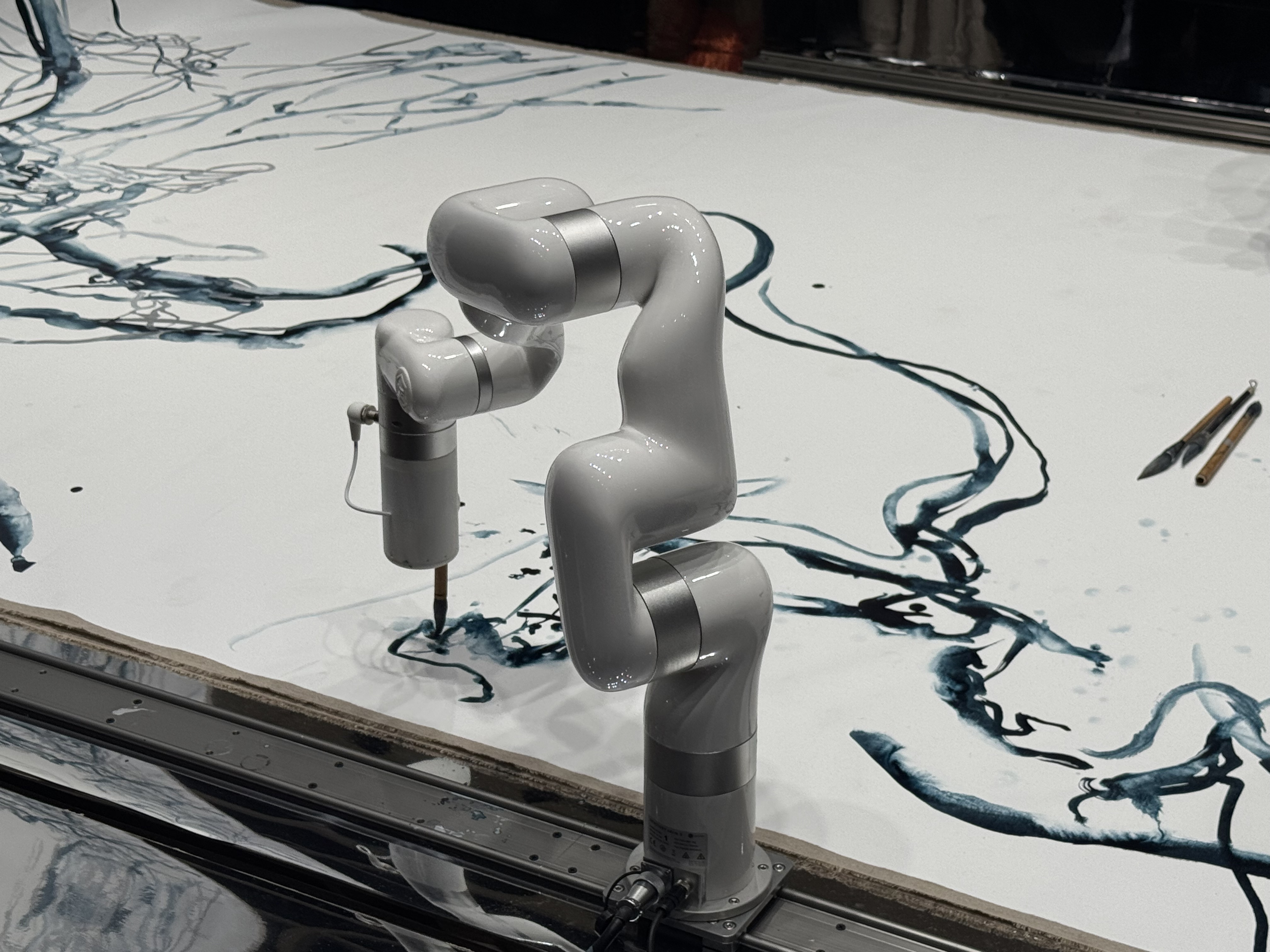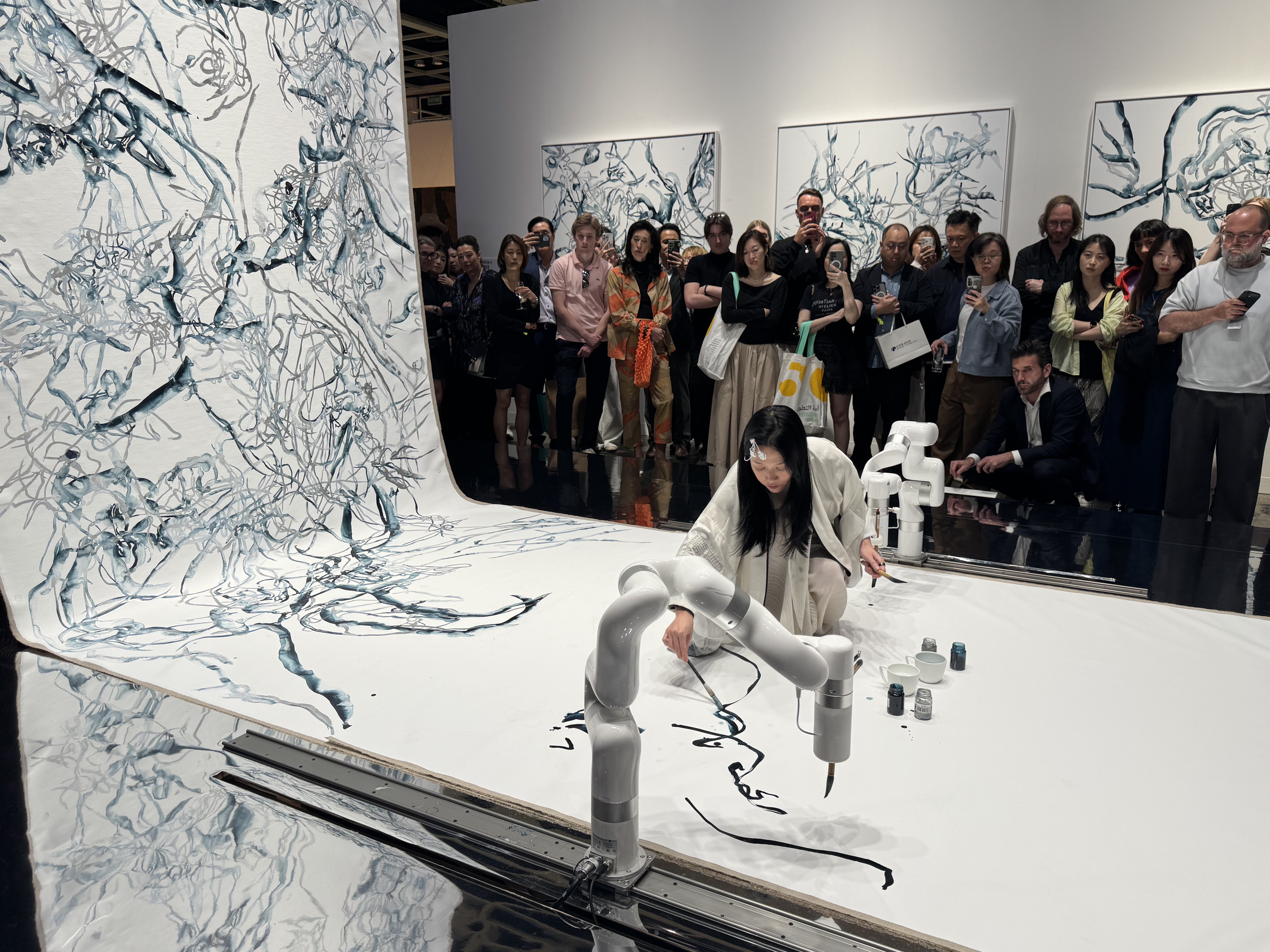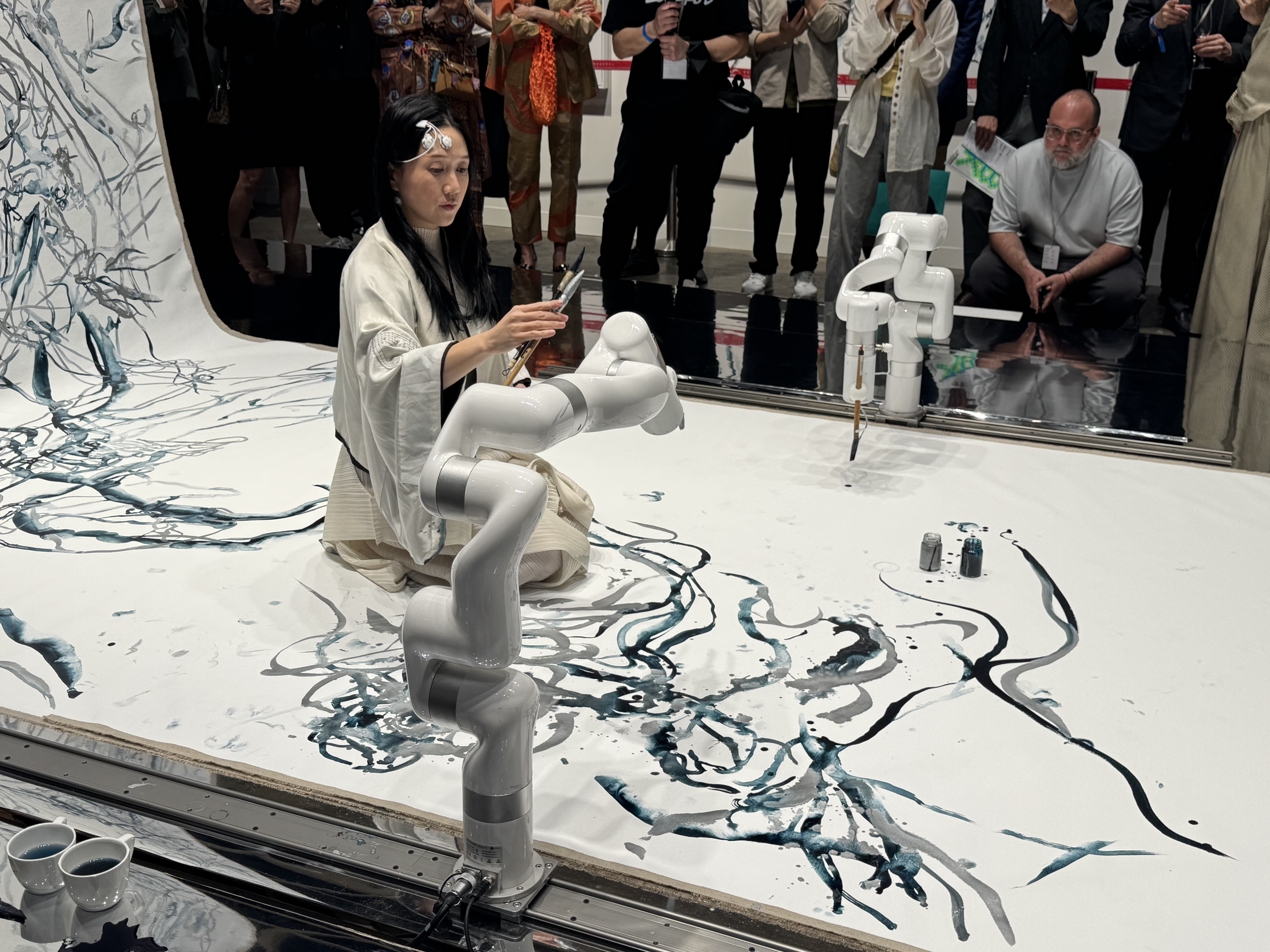 隨後,由華裔加拿大藝術家Sougwen Chung帶來了創作表演,她與機械手臂一起用毛筆和墨水在畫布上作畫,繪畫過程中,Sougwen Chung還會不時地與機械手臂接觸,像是在傳遞情感。