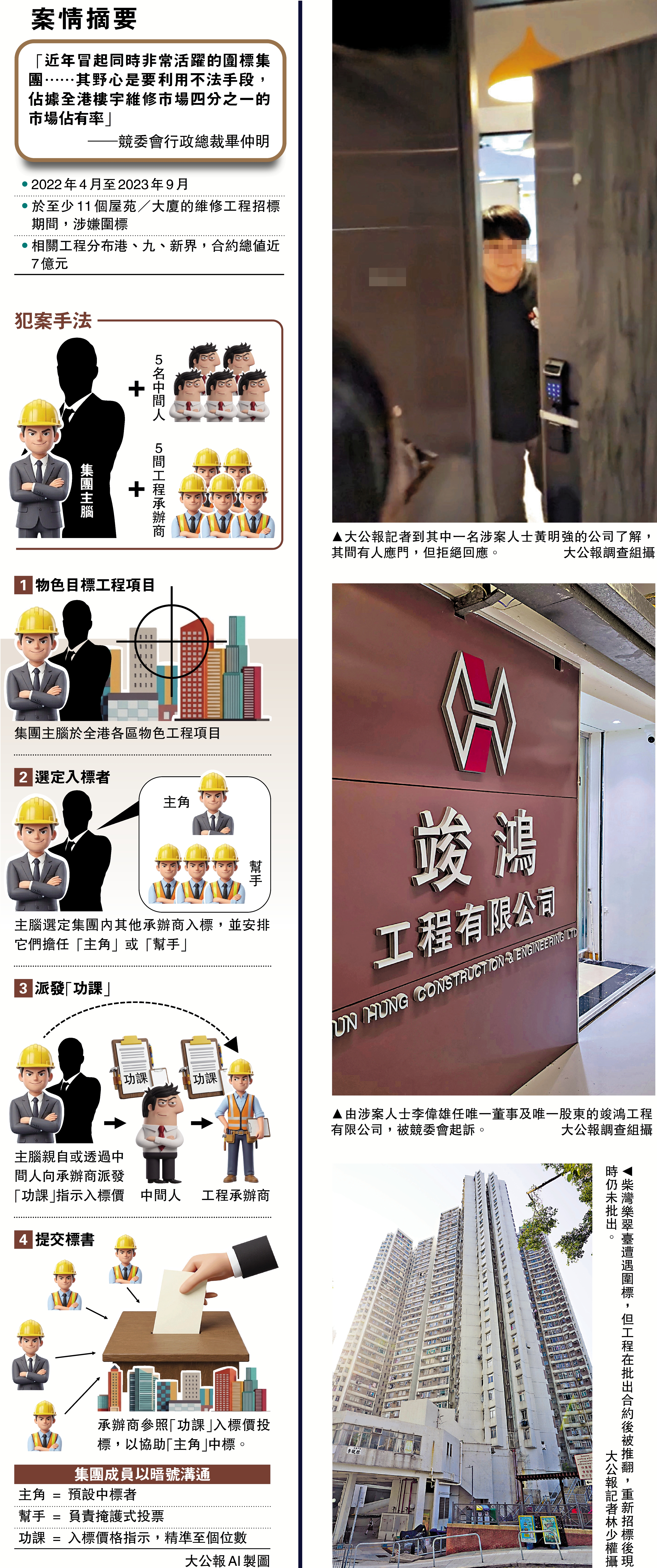 競委會指,涉案圍標集團由多個工程承辦商及中間人組成,集團主腦會先物色目標工程,再安排集團內其他承辦商入標,當中有承辦商屬預設中標的「主角」,其餘則擔任陪標掩護的「幫手」。集團主腦會親自或透過中間人向有關承辦商提供入標價錢指示,並以「功課」作暗號。以宏福苑個案為例,案情指,在2023年7月,有集團以外的人向圍標集團主腦問「宏福有功課嗎?」、「要多少件?」主腦回覆指「叫三件吧,明天交功課,後天交表」。