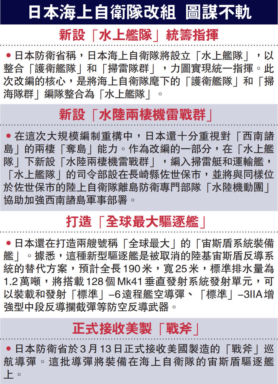 (大公報綜合杭州日報、第一財經、都市快報報道:)日本擴軍,露出獠牙。日本海上自衛隊3月23日實施了該組織有史以來最大規模的改組,本次改組大幅改變了海上自衛隊的運作方式,取消了自海上自衛隊創設以來一直存在的「護衛艦隊」編隊系統,改為由3個「水上戰群」等組成的「水上艦隊」。