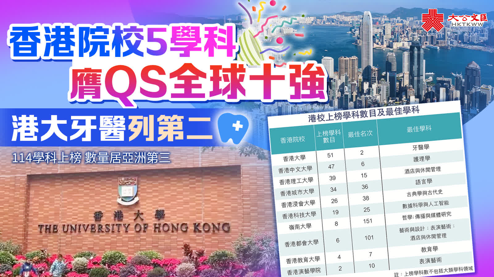 以院校上榜學科數量計,港大共有56個為全港最多,而香港中文大學緊隨其後有52科上榜。雖然今年香港有不少學科名次下跌,但仍有多所大學錄得淨提升,其中嶺南大學與教大進步最為顯著,升幅均達約33%,香港浸會大學亦上升約24%。