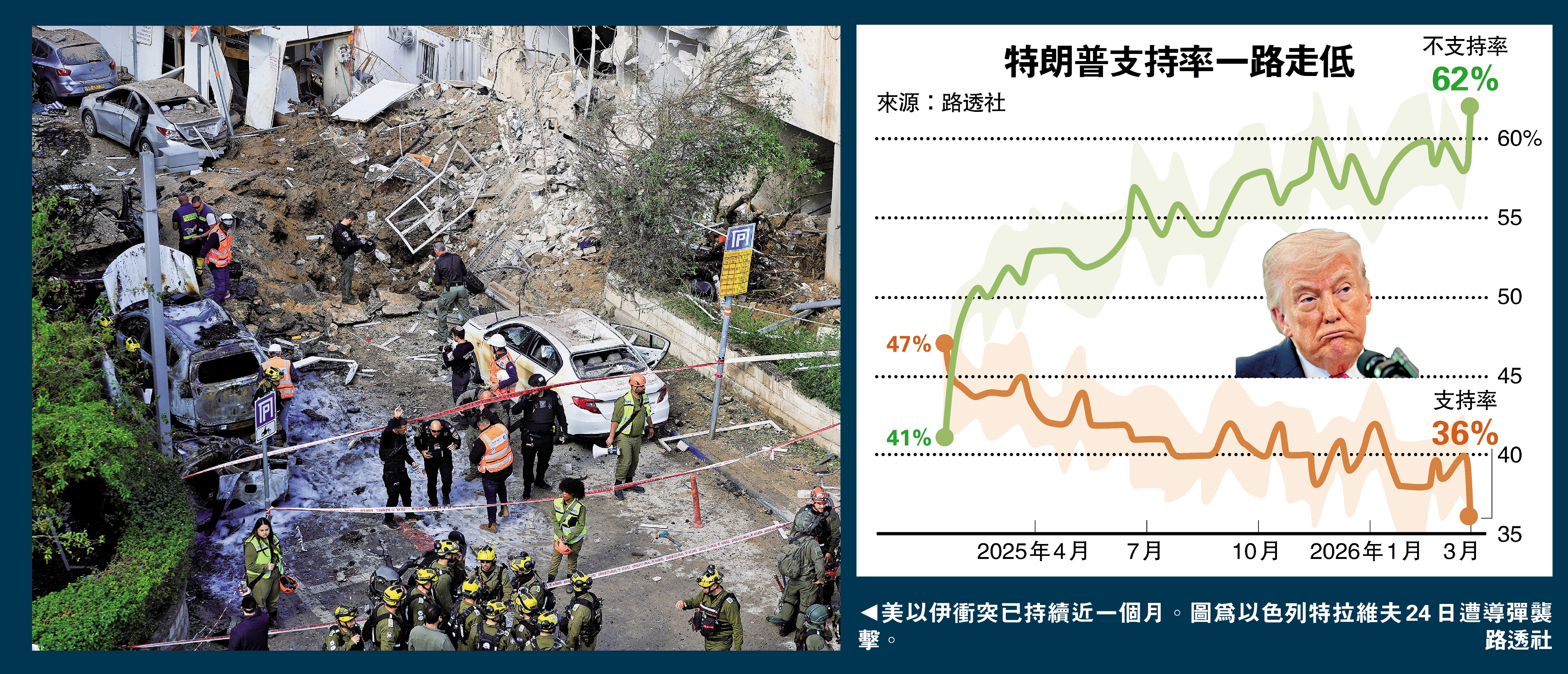 (大公報記者 郭嘉)最新公布的民調顯示,美國總統特朗普支持率降至36%,為其重返白宮以來最低水平,主要原因是美國民眾不滿其挑起與伊朗的戰爭。特朗普24日稱,對伊朗的戰爭「已經勝利」,美伊正在談判,伊朗已準備「達成協議」。但伊朗方面再次否認與美國談判,並直言「沒人能信任美國外交」。美國和以色列媒體披露,特朗普政府提出一份「15點計劃」。伊朗官方電視台25日報道,伊朗正式拒絕了美國提出的方案,並提出伊方停戰的5項條件。