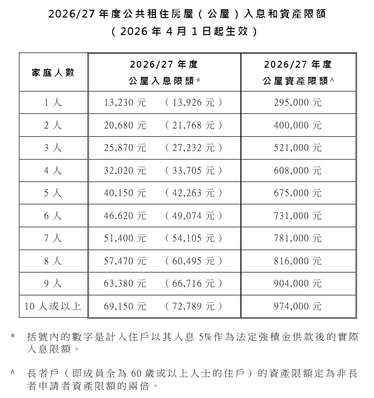 房委會發言人表示,公屋入息及資產限額每年按既定機制檢討。根據現行公式計算,小組委員會通過在2026/27年度,所有家庭人數住戶的公屋入息限額均會上調,整體平均上升2.8%。另外,小組委員會亦通過所有家庭人數住戶的資產限額按既定機制上調1.4%。