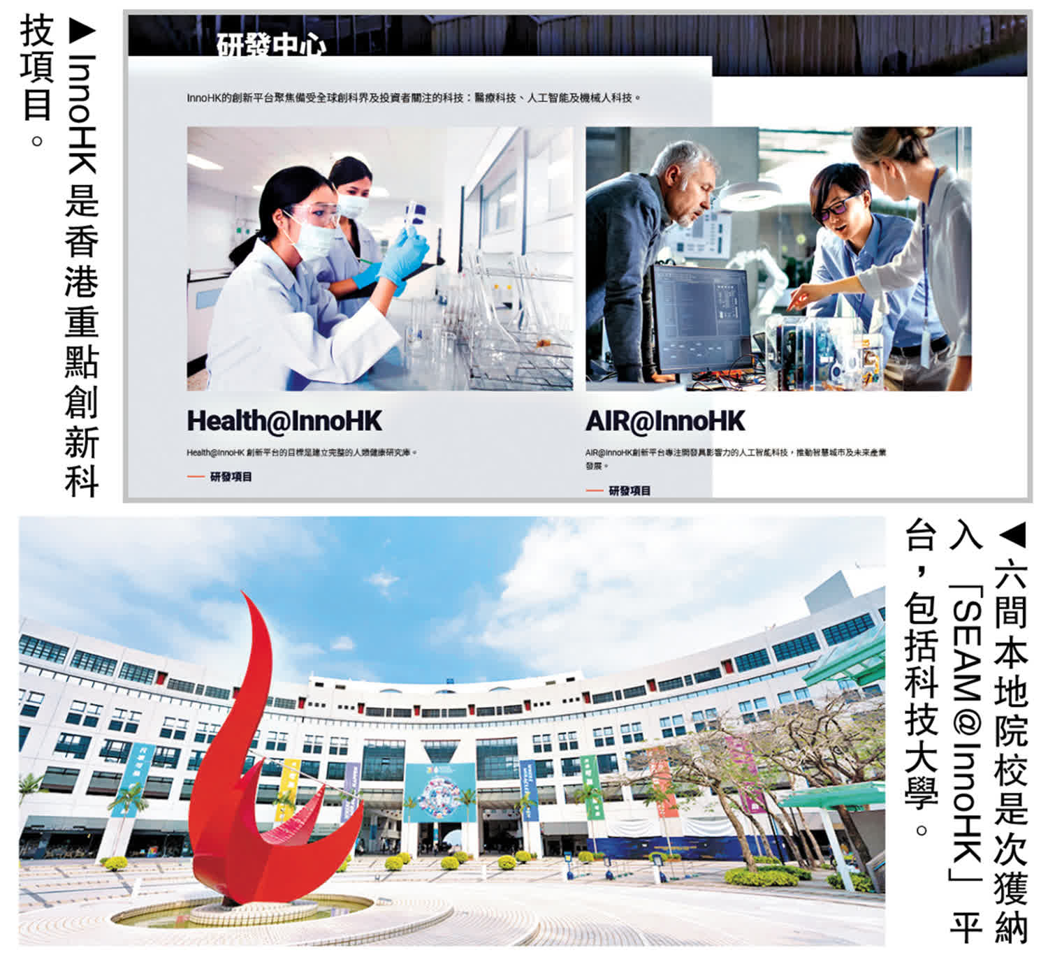 InnoHK是政府的重點創新科技項目,旨在發展香港成為環球科研合作中心,以吸納國際頂尖機構與本地大學/機構合作,在本港建立研發中心/實驗室。此舉除了有助頂尖大學、科研機構及業界合作研發外,亦有利科研成果轉化為具影響力的實際應用,以及帶動本地相關產業的發展。之前已設立的兩個InnoHK研發平台,分別為「Health@InnoHK」、「AIR@InnoHK」。現時正大力推展的為第三個研發平台「SEAM@InnoHK」。