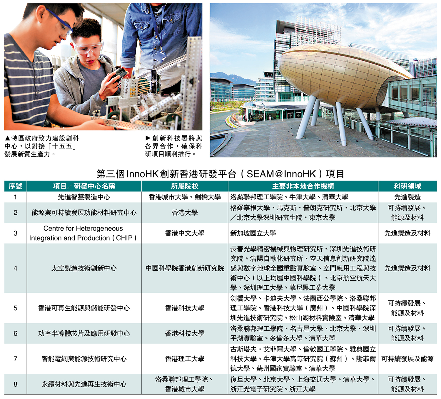 八個獲納入第三個「SEAM@InnoHK」平台項目的院校,有六間來自本港,兩間來自英國和瑞士頂尖學府。