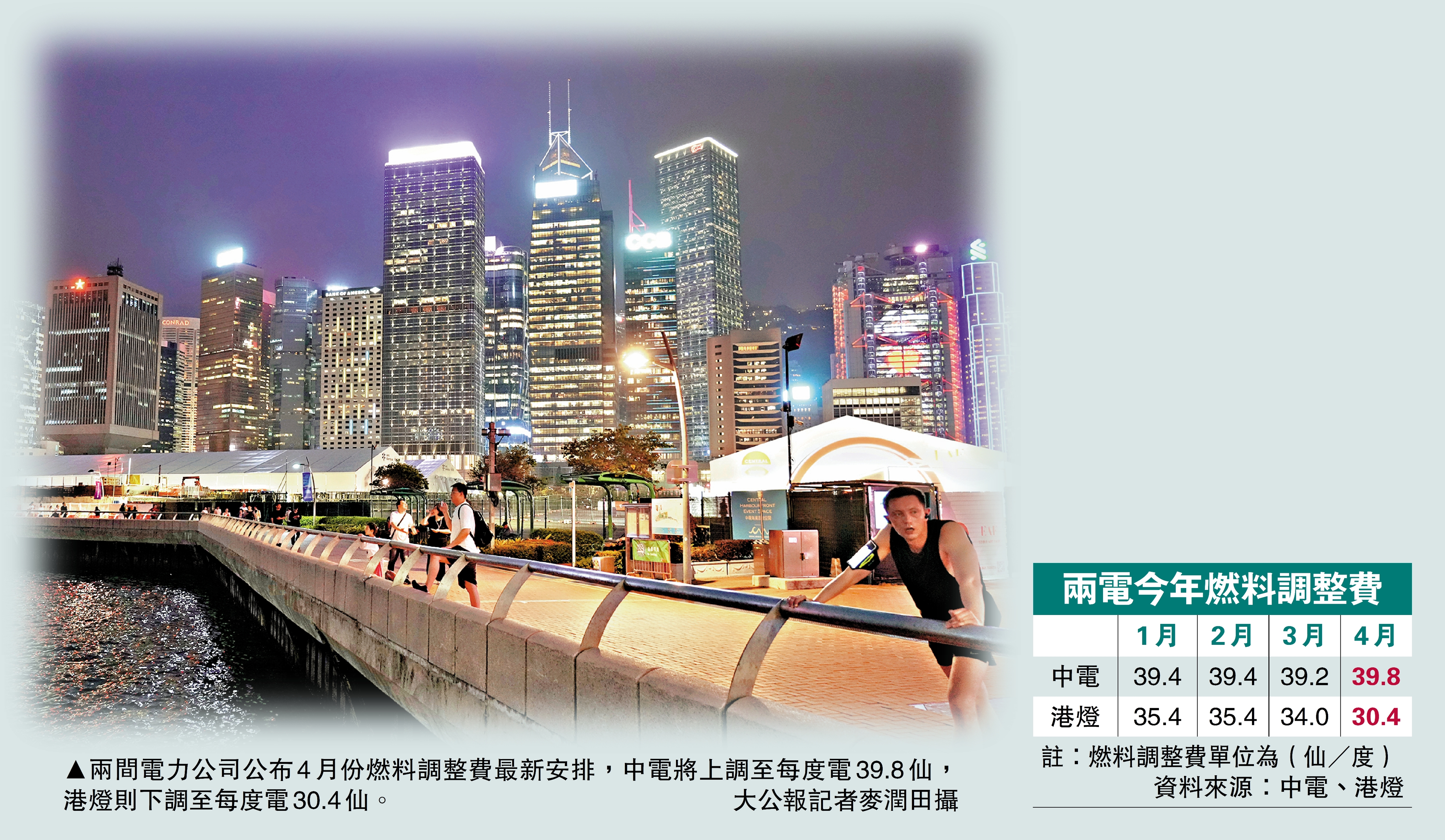 (大公報記者 肖泓宇)本港兩間電力公司相繼公布4月份燃料調整費最新安排。中電宣布,4月1日起燃料調整費將上調至每度電39.8仙,淨電費較本月上調0.4%至141仙,為今年首次上調。港燈昨日宣布,因遞延效應,4月燃料費下調至每度電30.4仙,預計若燃料成本持續高企,今年中起淨電費或顯著上升。
