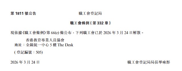 大公文匯全媒體報道,職工會登記局今日(27日)刊憲,依據《職工會條例》第66(c)條公布,香港教育人員協會(教協)已於2026年3月24日解散。