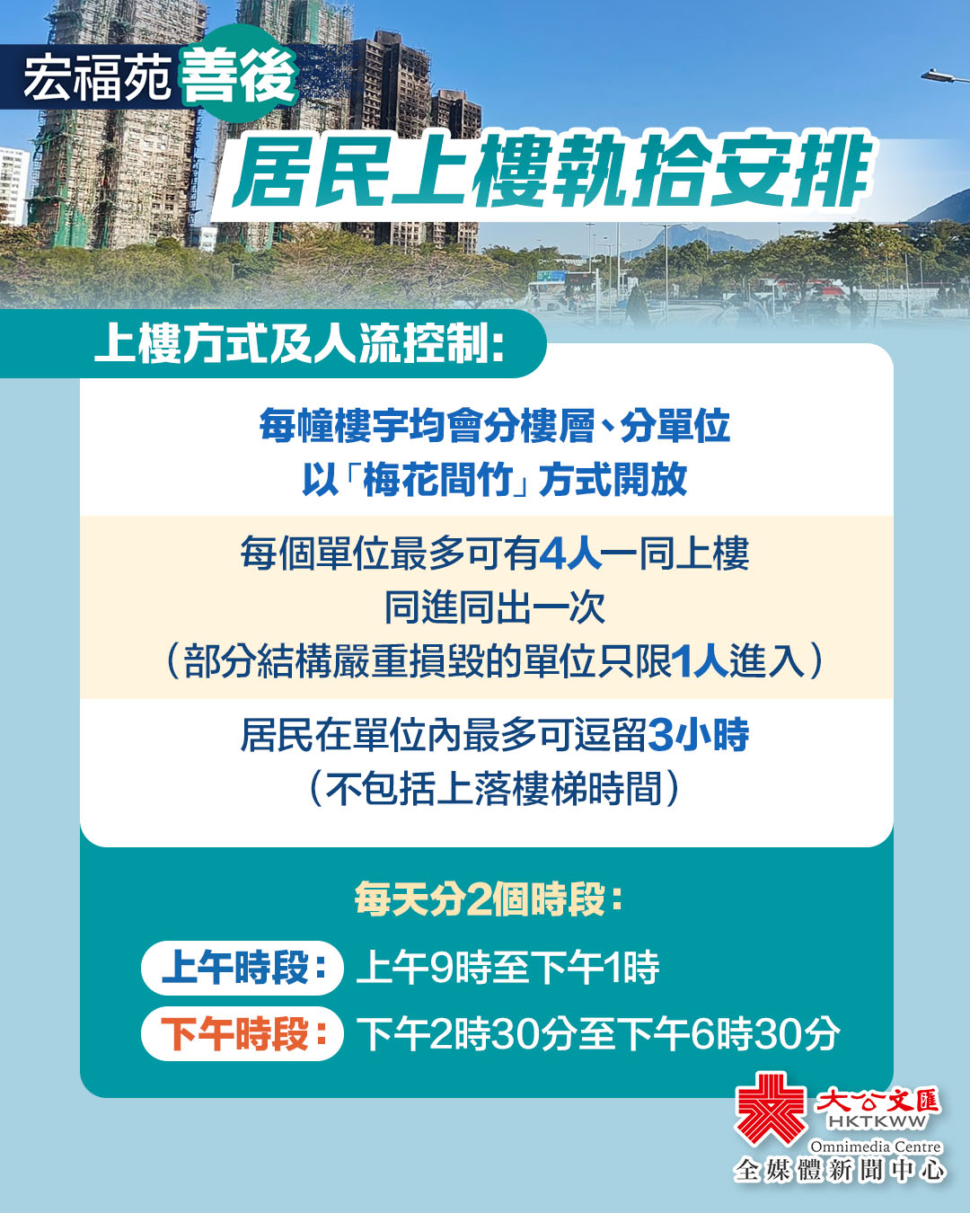 分幢及分階段安排方面,宏新閣、宏仁閣、宏道閣、宏建閣和宏盛閣5幢樓宇會各用3天時間完成上樓,每天分上、下午時段一共開放約10個樓層,至於宏昌閣和宏泰閣,由於單位被大火焚毀的情況特別嚴重,居民上樓需要更多支援,兩幢大廈會各用6天時間完成,每天會開放約5個樓層。