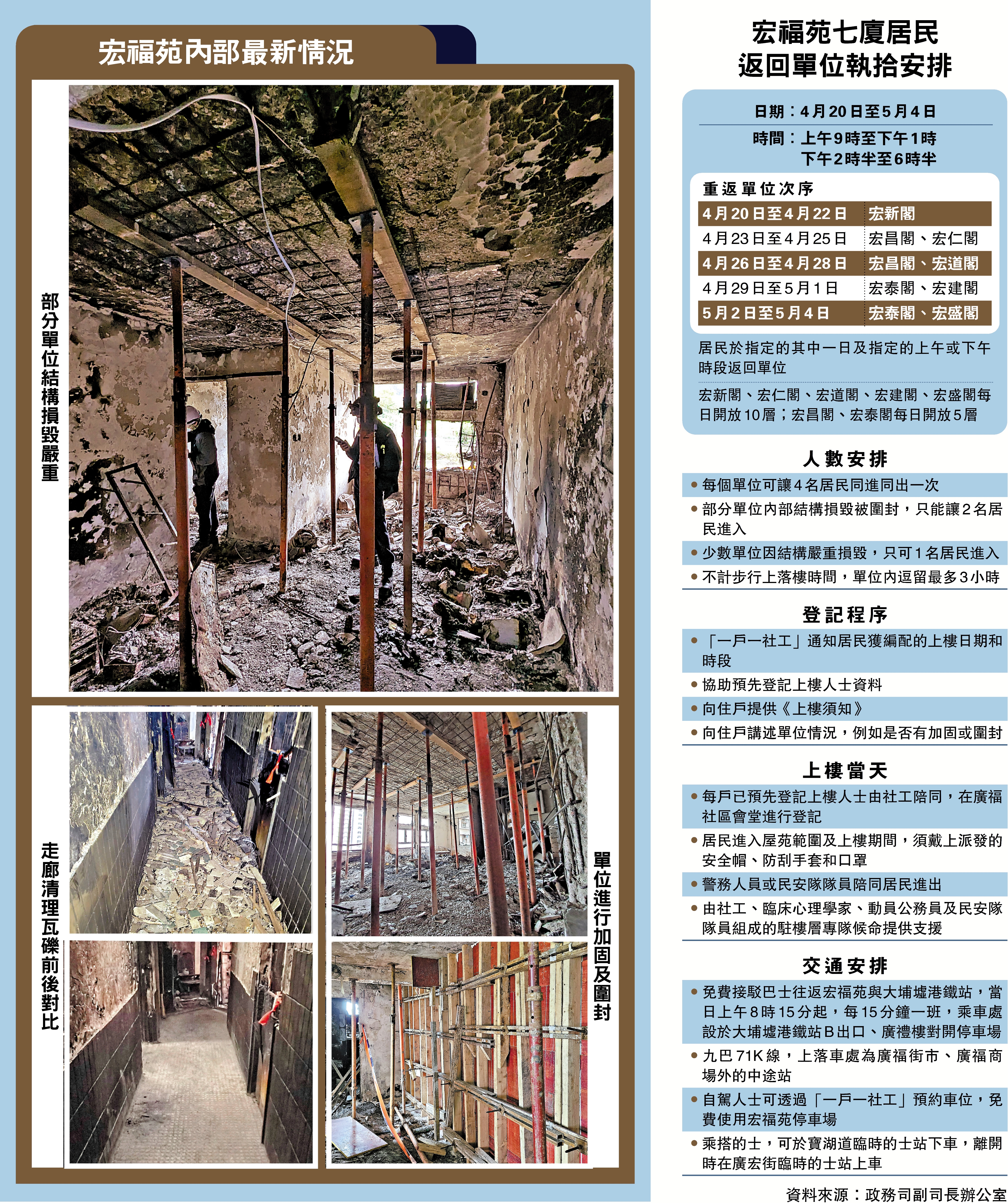 卓永興表示,非常重視居民欲回家看看和收拾物件的訴求,但必須確保居民是在安全情況下上樓。4月20日至5月4日,宏福苑七幢樓的居民會獲安排於指定時間分批返回單位,每天分上下午兩節上樓,首輪將開放宏新閣作為流程測試,其後兩輪依次開放餘下六座大廈(詳見表)。