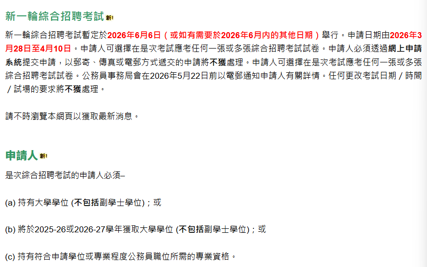 楊何蓓茵提醒有志進入政府公務員體系的考生,有意投考學位或專業程度公務員職位的人士必須具備有效的CRE成績。第二,政府已擴展投考需學士學位學歷要求公務員職位的資格至大學三年級(四年制學士學位課程)學生,換言之,2026年應屆大學畢業生、2027年大學畢業生,以及持有大學學位、符合職位所需的專業資格的人士,均可報考這輪CRE。