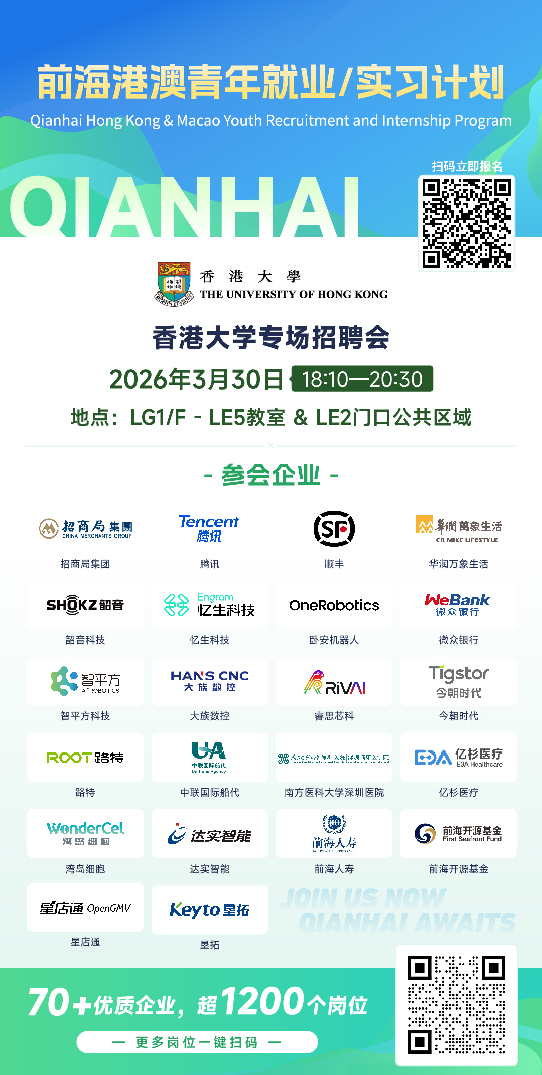 記者了解到,3月30日活動將攜更強大名企陣容走進香港大學,舉辦專場招聘會。招商局集團、騰訊、韶音科技等頭部企業將現場設展,帶來更多優質崗位與發展機遇,持續為港澳青年拓寬灣區就業通道。本次計劃採用「線上+線下」聯動模式,同學們可提前在線了解企業信息、精準投遞簡歷,現場與HR深度交流,實現高效匹配。