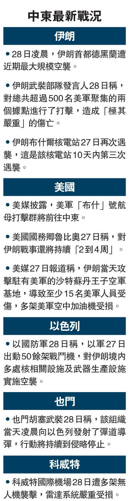 (大公報記者 陳明)當地時間3月28日凌晨,伊朗首都德黑蘭遭到近期規模最大的空襲,中東戰火持續升級。也門胡塞武裝當天凌晨向以色列發射彈道導彈,標誌該組織正式介入美以伊戰爭。另外,美國國務卿魯比奧27日透露,預計對伊朗的軍事行動還將持續「2到4周」。美媒披露,美軍「布什」號航母打擊群將前往中東,這意味着美軍可能將有3艘航母投入對伊作戰。