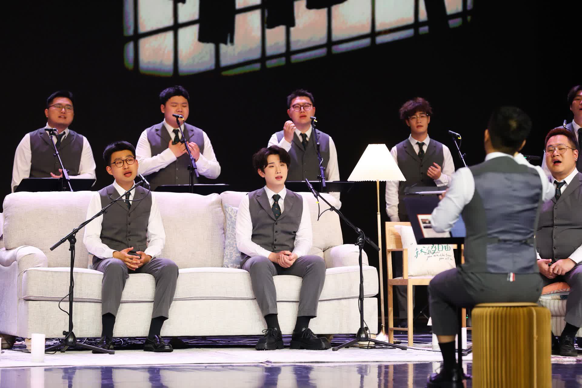 作為一支特色鮮明的全男聲合唱團,吾恣室內合唱團此次延續了標誌性的「客廳氛圍」,石家莊站特別支持單位創典居精心打造出充滿溫馨感的客廳式觀演空間,從舞台布置到現場氛圍營造,讓觀眾彷彿置身於溫馨的家庭客廳。演出中,團員們以低吟淺唱的溫柔唱腔,讓現場觀眾在舒緩的旋律中放下疲憊,沉浸式感受音樂帶來的治癒力量。