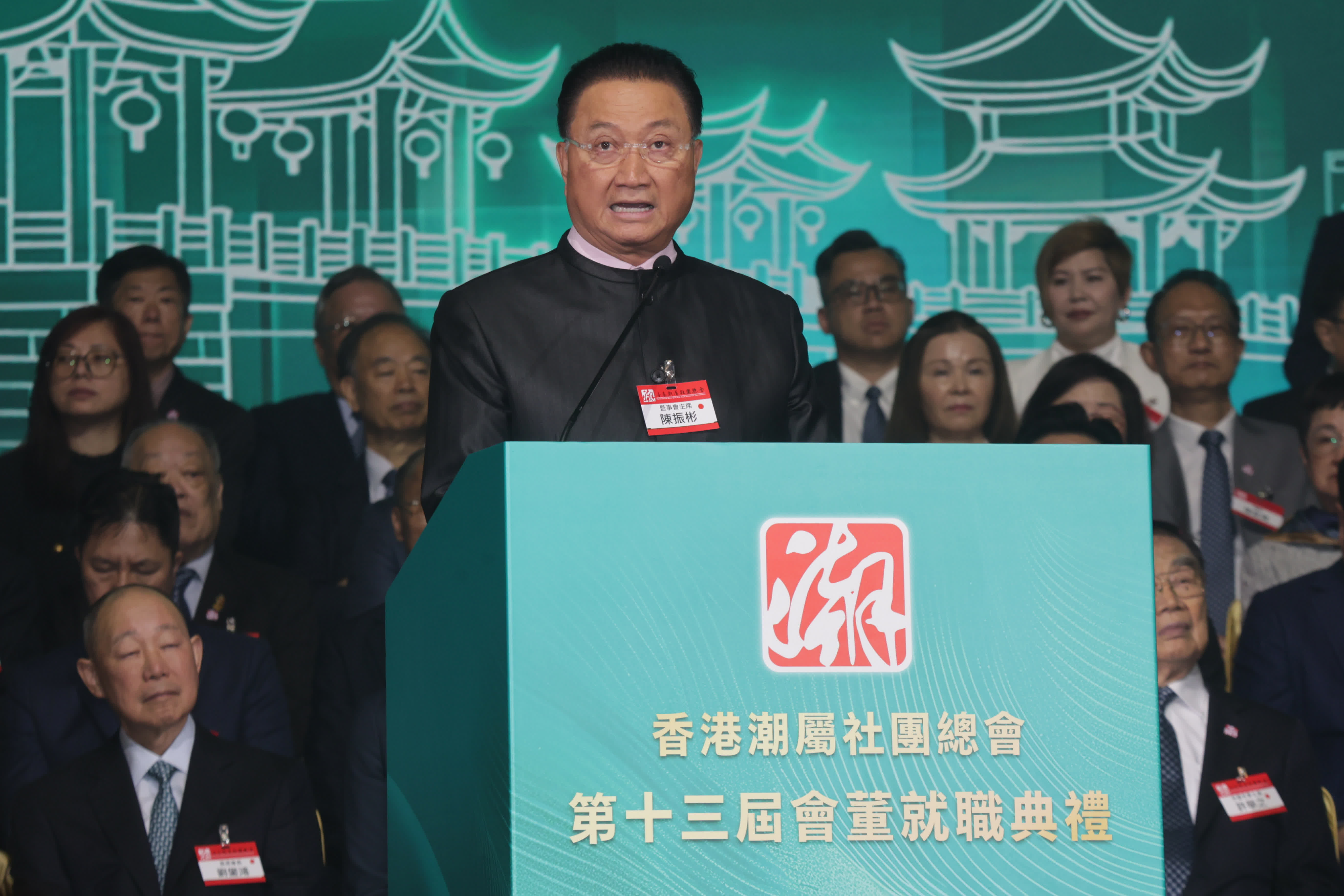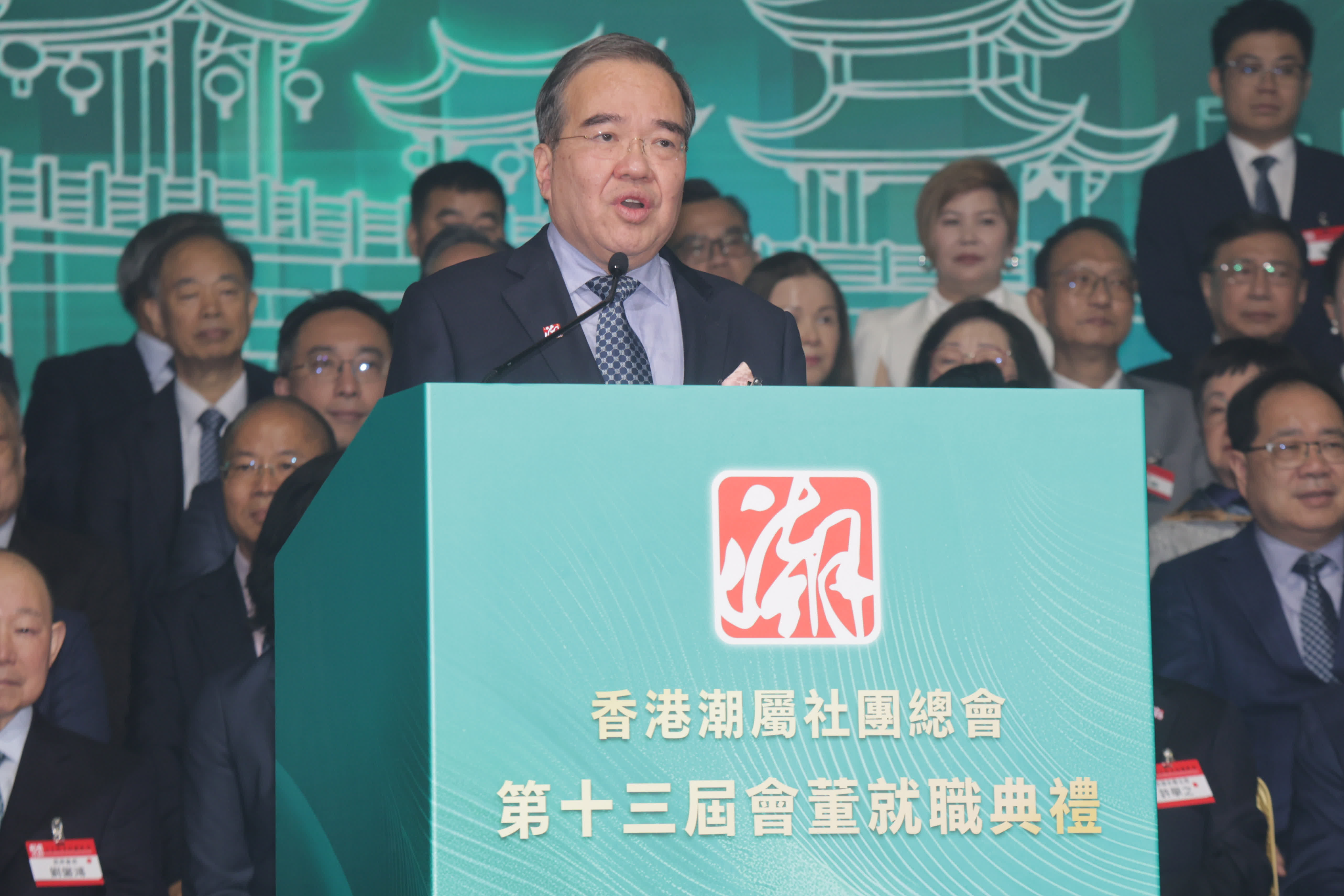 潮總主席胡定旭致辭表示,潮總未來將聚焦青年、婦女與文化傳承三大發展方向,凝聚全港百餘萬潮籍鄉親力量,全力支持特區政府施政,助力香港社會安定、經濟繁榮。同時依托潮總作為國際潮團總會常務理事單位的優勢,搭建內地與香港、中國與世界的溝通橋樑,講好中國故事、香港故事、潮人故事。