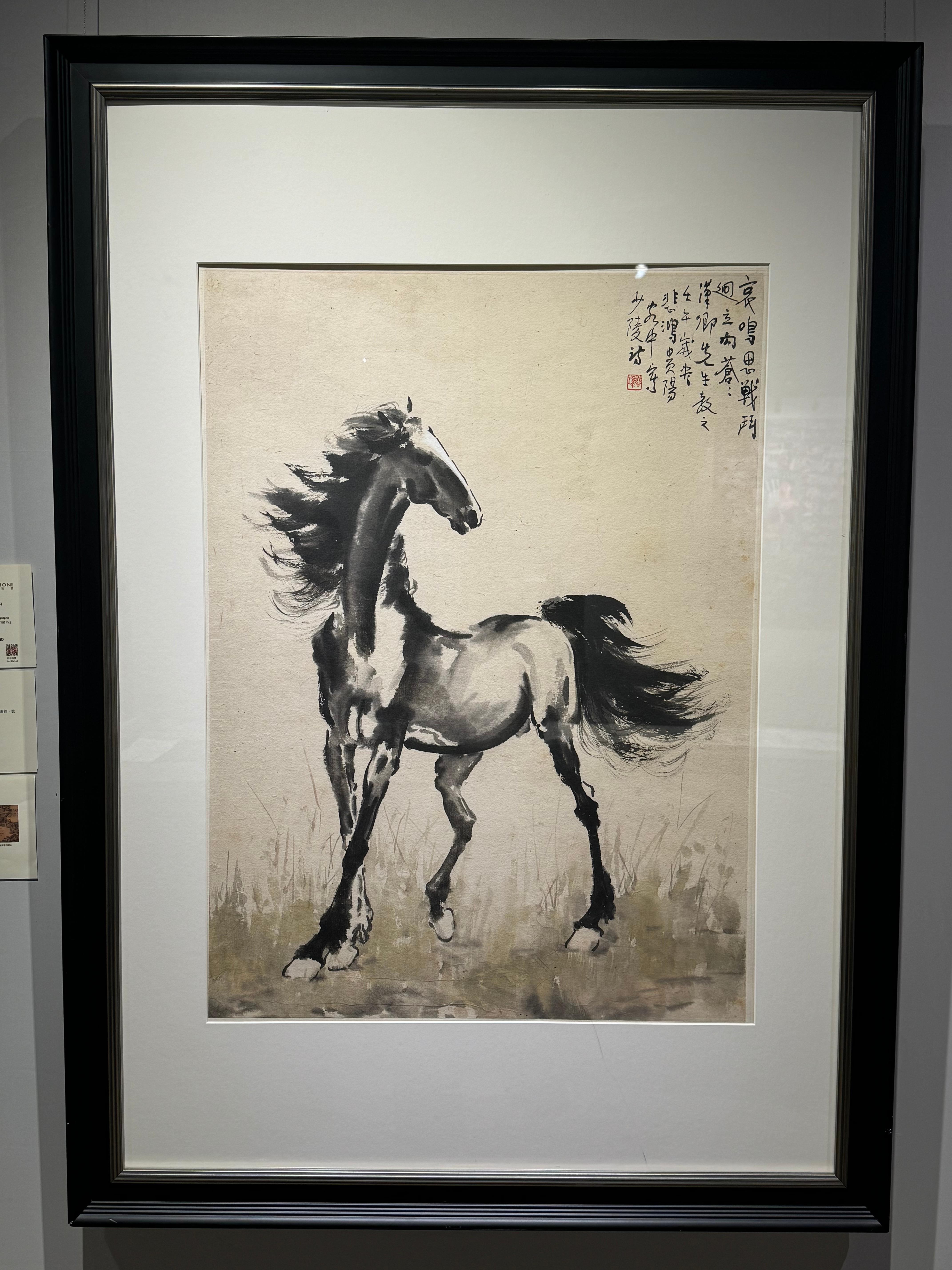 在書畫區域,保利香港拍賣中國書畫部助理部門主管程遠楓介紹,徐悲鴻的《立馬》(1942年)兼具藝術價值和歷史價值。此畫專為張學良而作,彼時張學良被困貴州,徐悲鴻用昂首佇立的駿馬配以杜甫名句「哀鳴思戰鬥,迥立向蒼蒼」鼓舞張學良。此畫由張學良1994年賣出,是證明二人有交集的重要史料。