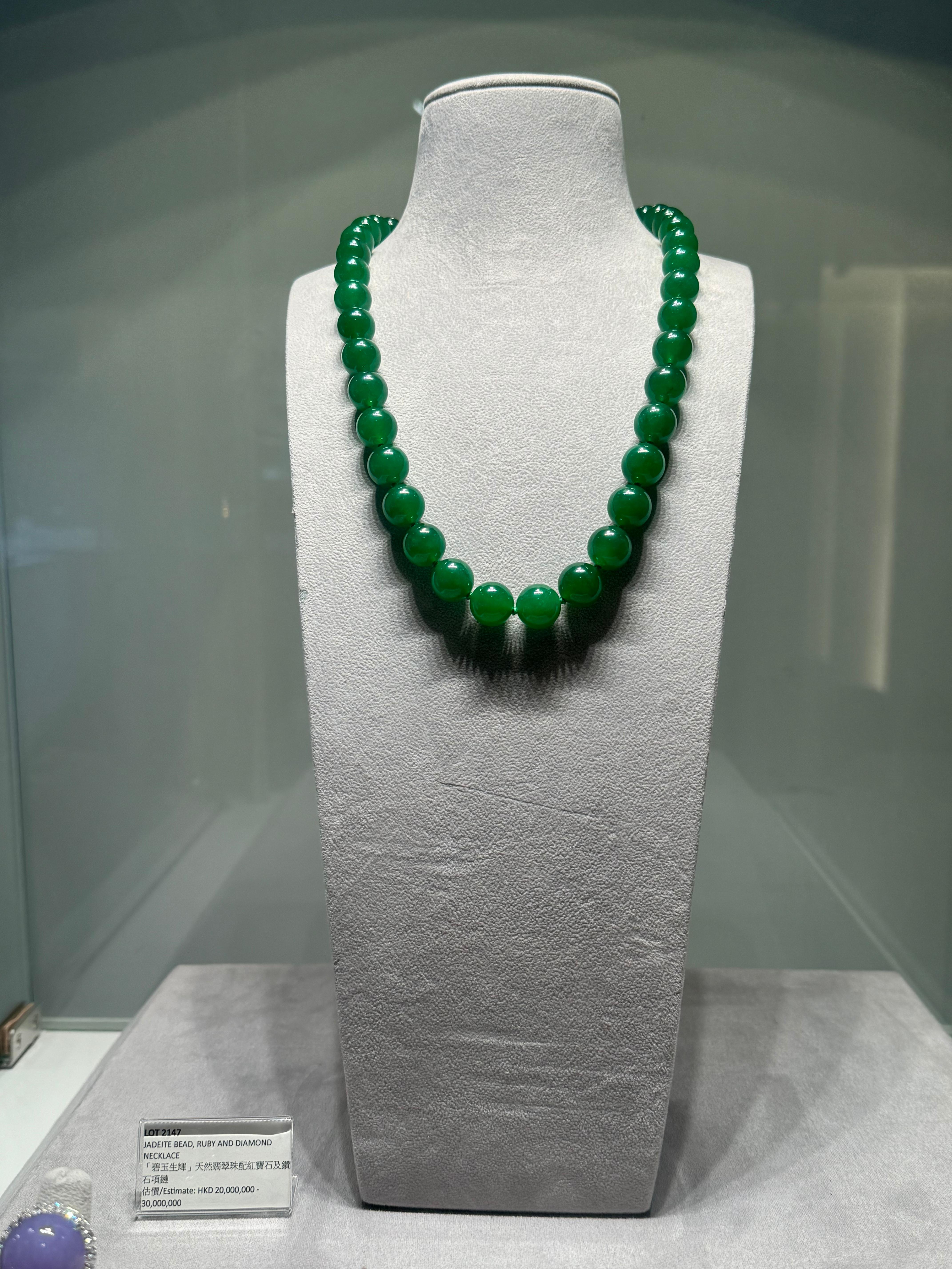 珠寶展區方面,保利香港拍賣珠寶高級專家黨凱翎介紹,拍品價值由幾萬到上億不等,其中「碧玉生輝」天然翡翠珠配紅寶石及鑽石項鏈和8.02克拉枕形克什米爾「皇家藍」藍寶石戒指最具投資及收藏價值。