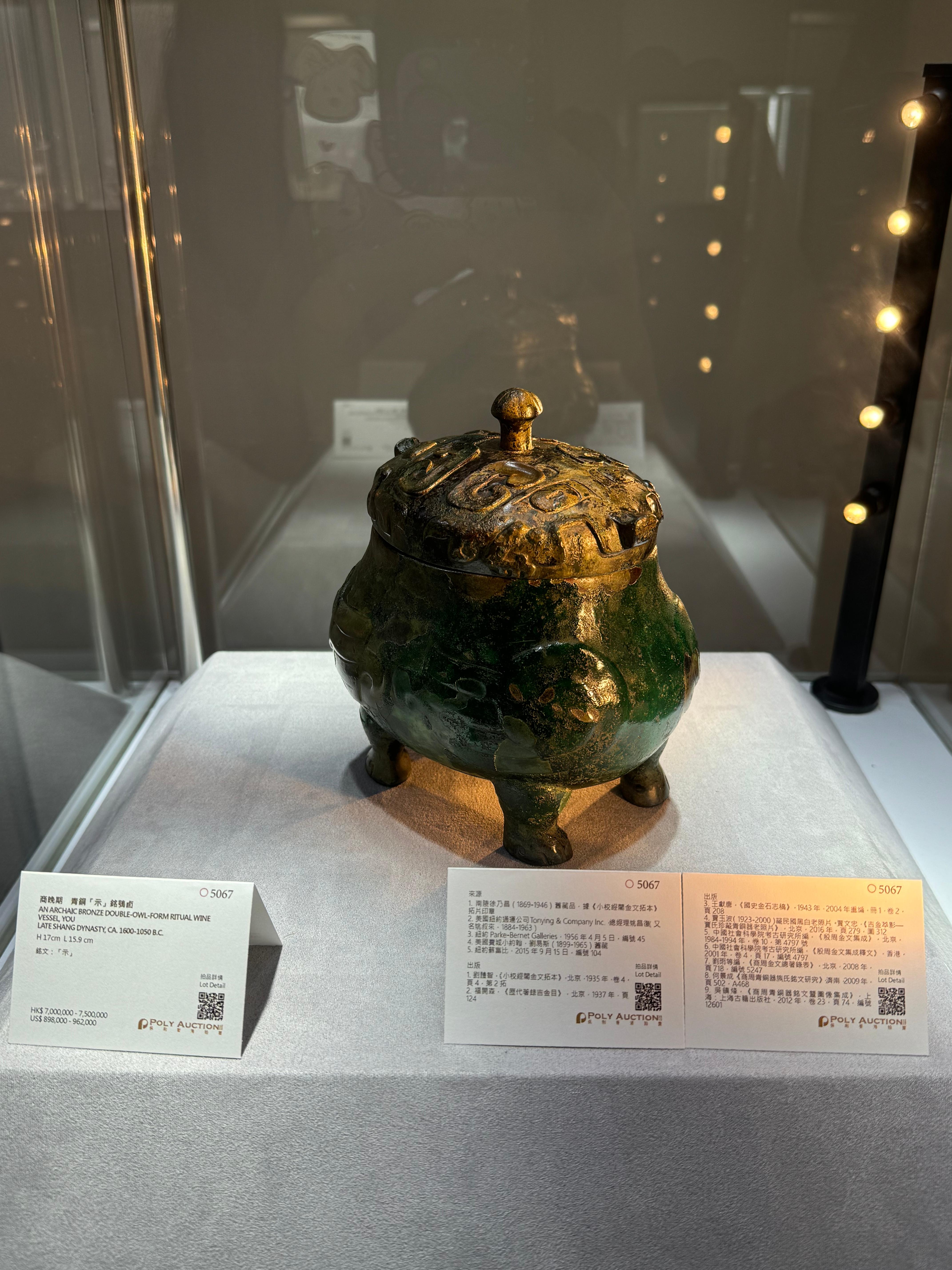 商晚期青銅「示」銘鴞卣用於祭祀盛酒,以兩隻貓頭鷹背靠背為造型,形態罕見。該藏品流傳有序、來源清晰,曾為徐乃昌(1869-1946)舊藏,並多次經權威出版着錄。