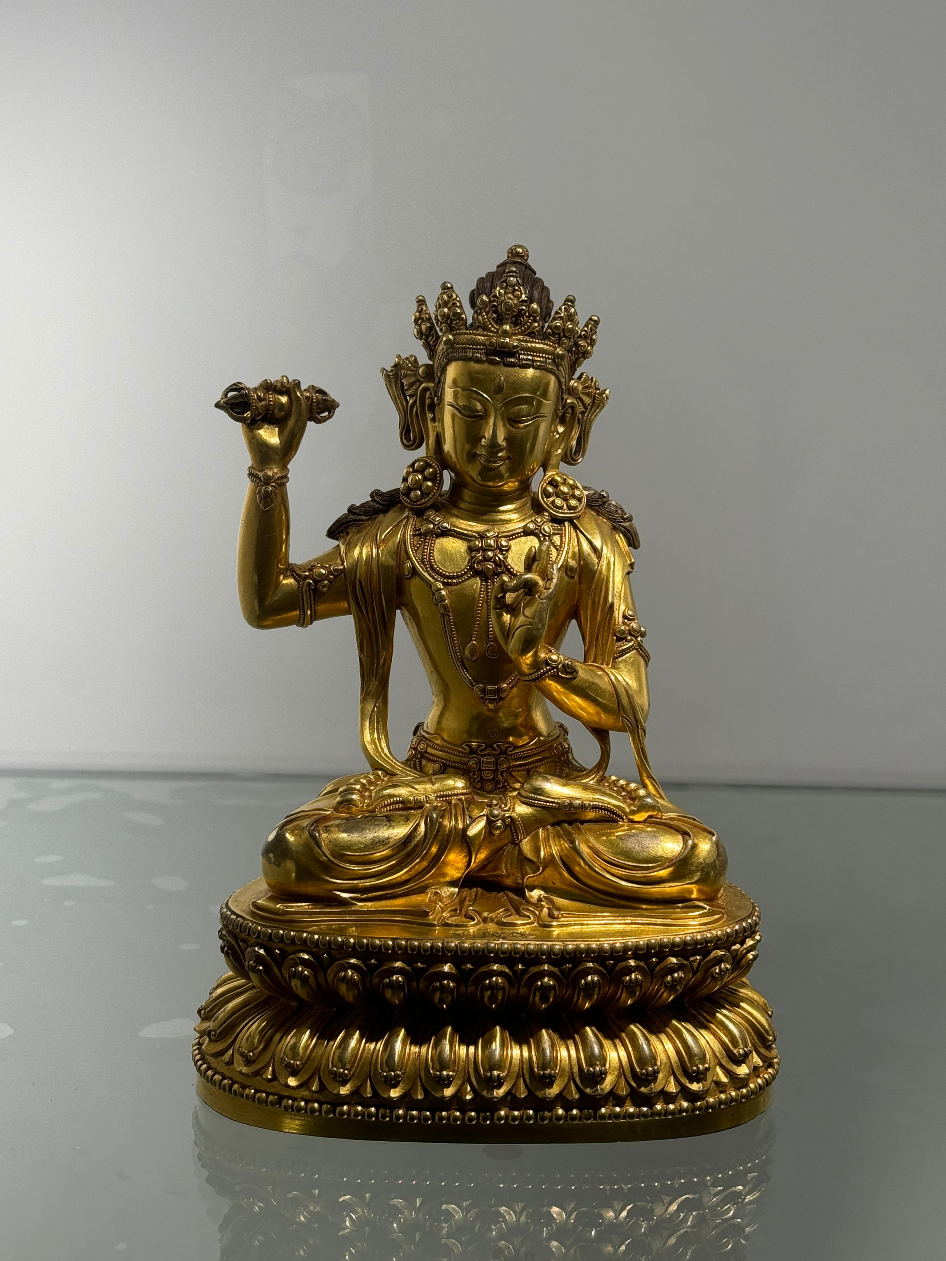 明永樂銅鎏金金剛手菩薩「大明永樂年施」為宮廷佛造像,曾為英國古董商Jules Speelman珍藏。此尊造像線條優美流暢、寶冠、瓔珞、髮髻等細節刻畫豐富,工藝精湛,體現了當時金屬冶煉和鑄造技術的高度水平。