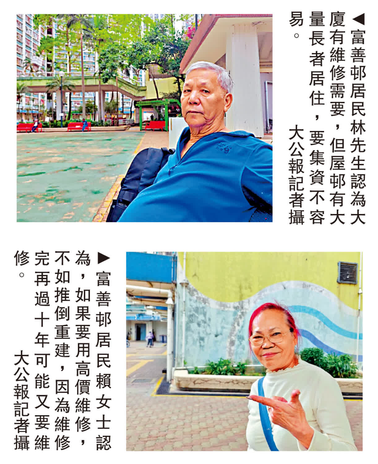 富善邨樓齡約41年,需要進行大維修。大公報記者昨日到富善邨,從外觀察,除了小部分牆身有瓦片脫落外,未見嚴重的老舊痕跡。對於大維修,居民反應兩極,有居民不願負擔天價維修費,亦有人認為樓齡已高需要維修。